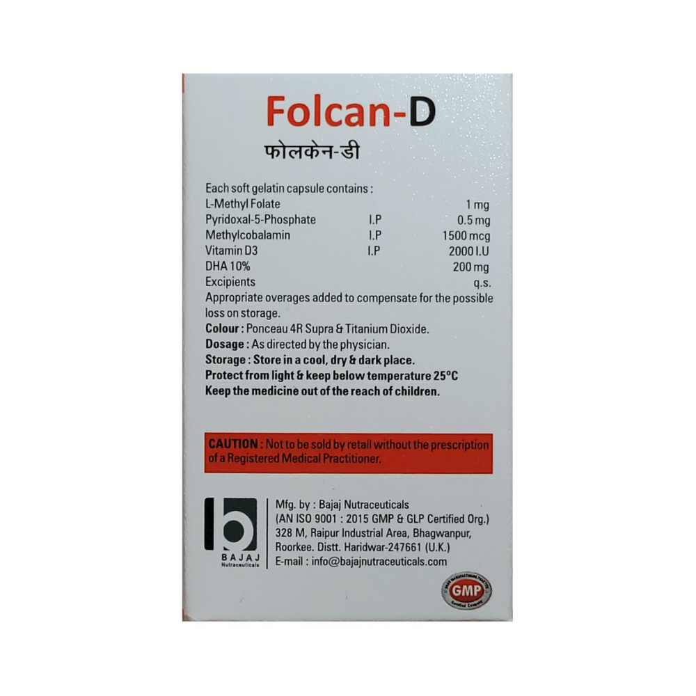 Folcan-D Softgel Capsule is a combination of five medicines : L-Methyl Folate, Methylcobalamin, Pyridoxal-5-phosphate, Vitamin D3, and Docosahexanoic acid (DHA). L-methylfolate is the primary biologically active isomer of folic acid and the primary form of folate in circulation. Folic Acid is a form of vitamin B. It plays a vital role in the formation of red blood cells, which carry oxygen throughout the body. It is also essential in pregnancy due to its role in the development of the unborn baby's brain and spinal cord. Methylcobalamin is a form of vitamin B12 that restores its level in the body thereby helping in treating certain anemias and nerve problems. Pyridoxal-5-phosphate is a nutritional supplement that provides essential nutrients to our body and improves overall health. Vitamin D3 is a form of vitamin D. It raises vitamin D levels in your blood. This in turn raises calcium levels in your blood by helping you absorb more calcium from food. Docosahexaenoic acid (DHA) belongs to the class of medications called nutritional supplements. DHA plays a vital role in brain development. DHA decreases cholesterol and triglyceride levels, inhibits platelet aggregation and oxidation of LDL, decreases the synthesis of inflammatory markers such as prostaglandins. Overall, DHA plays a vital role in reducing the heart and circulatory disease risks.