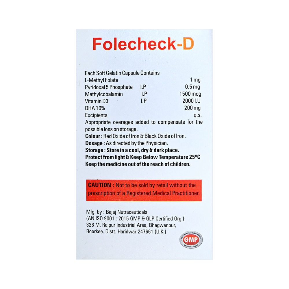 Folecheck-D Softgel Capsule is a combination of five medicines : L-Methyl Folate, Methylcobalamin, Pyridoxal-5-phosphate, Vitamin D3, and Docosahexanoic acid (DHA). L-methylfolate is the primary biologically active isomer of folic acid and the primary form of folate in circulation. Folic Acid is a form of vitamin B. It plays a vital role in the formation of red blood cells, which carry oxygen throughout the body. It is also essential in pregnancy due to its role in the development of the unborn baby's brain and spinal cord. Methylcobalamin is a form of vitamin B12 that restores its level in the body thereby helping in treating certain anemias and nerve problems. Pyridoxal-5-phosphate is a nutritional supplement that provides essential nutrients to our body and improves overall health. Vitamin D3 is a form of vitamin D. It raises vitamin D levels in your blood. This in turn raises calcium levels in your blood by helping you absorb more calcium from food. Docosahexaenoic acid (DHA) belongs to the class of medications called nutritional supplements. DHA plays a vital role in brain development. DHA decreases cholesterol and triglyceride levels, inhibits platelet aggregation and oxidation of LDL, decreases the synthesis of inflammatory markers such as prostaglandins. Overall, DHA plays a vital role in reducing the heart and circulatory disease risks.