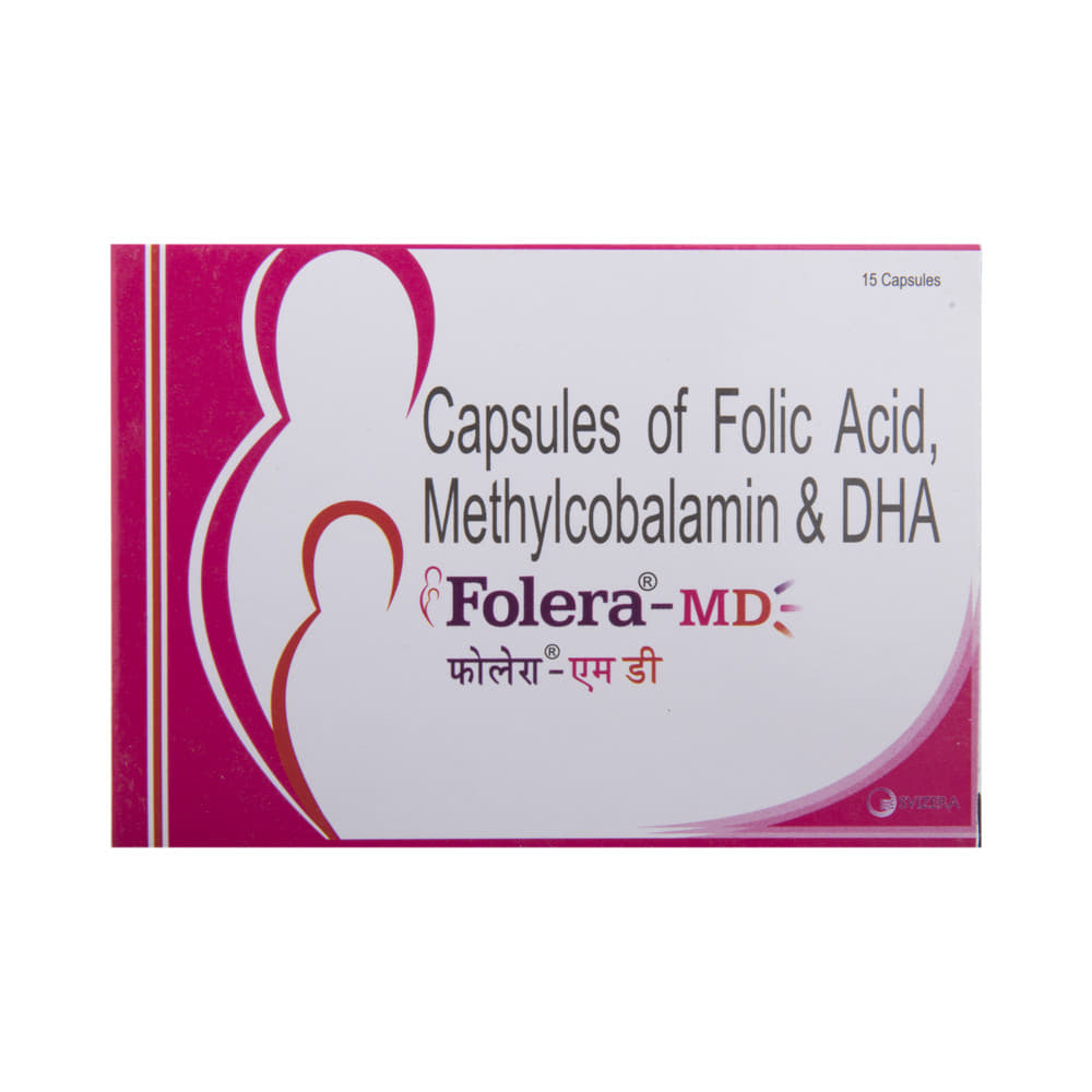 Folera-MD Capsule is a combination of three medicines: folic acid, cyanocobalamin, and docosahexaenoic acid (DHA). Folic acid is a form of vitamin B. It plays a vital role in the formation of red blood cells, which carry oxygen throughout the body. Cyanocobalamin is a form of vitamin B12 that provides essential nutrients. Docosahexaenoic acid (DHA) belongs to the class of medications called nutritional supplements. DHA plays a vital role in brain development. DHA decreases cholesterol and triglyceride levels, inhibits platelet aggregation and oxidation of LDL, and decreases the synthesis of inflammatory markers such as prostaglandins. Overall, DHA plays a vital role in reducing heart and circulatory disease risks.