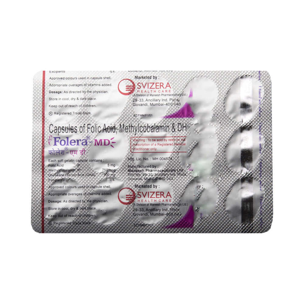 Folera-MD Capsule is a nutritional supplement. It is taken to treat conditions caused by a deficiency of vitamins, minerals, and other nutrients in the body. It ensures proper growth and improves the functioning of the body. It also plays a vital role in reducing heart and circulatory disease risks. Folera-MD Capsule may be taken with or without food. Take it in the dose and duration advised by the doctor. To get the most benefit, take it regularly at the same time each day and continue taking it until your prescription is finished. Do not take it for more than or longer than prescribed by the doctor, as that may cause harmful effects.Folera-MD Capsule is generally a safe medicine with little or no side effects. However, if you experience any symptoms that you think are caused by the medicine, let your doctor know. They may be able to suggest ways to reduce or prevent the side effects.To make sure it is safe for you, let your doctor know if you have any preexisting medical conditions or if you are taking any other medications before taking Folera-MD Capsule. Pregnant and breastfeeding women should consult their doctor before taking this medicine to make sure it is safe for them.
