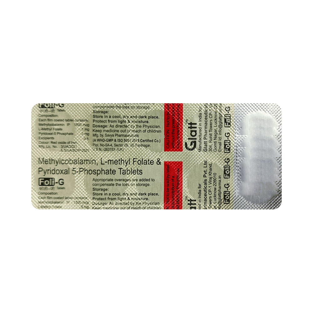 Foli-G Tablet is a combination medicine that is used in the treatment of nutritional deficiencies. It helps in the growth and development of the body and replenishes the body's stores of important nutrients. Foli-G Tablet may be taken with or without food. Take it in the exact dose and duration as prescribed by your doctor. Take the medicine at a fixed time to help you remember to take it. Do not take more than the recommended dose.Foli-G Tablet is generally well tolerated and does not usually cause side effects. However, if you experience any symptoms while on treatment with Foli-G Tablet, let your doctor know. If you experience any symptoms of severe allergic reactions like swelling, itching, difficulty breathing, and hives, contact your doctor immediately.Before taking Foli-G Tablet, let your doctor know if you have any preexisting medical conditions. Do not take medicine if you have a known history of allergic reactions to any components in Foli-G Tablet. This medicine is generally safe for pregnant and breastfeeding women.