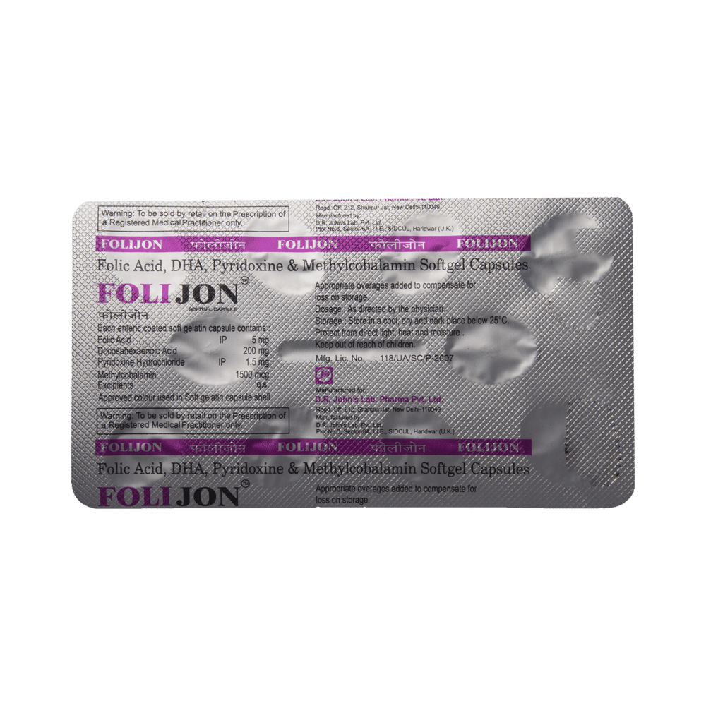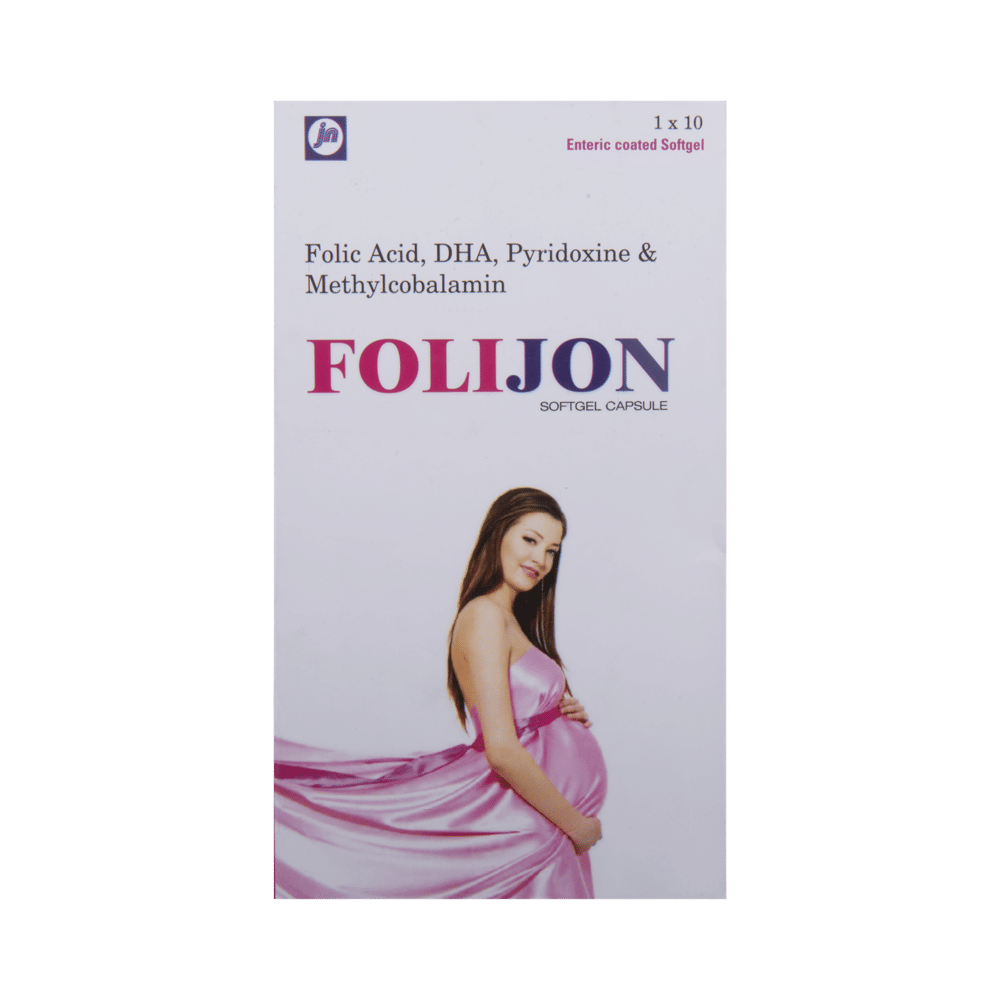 Folijon Soft Gelatin Capsule is a combination of vitamin B9, B12, B6, and docosahexaenoic acid (DHA). Folic acid is essential for production of red blood cells. It prevents and treats folate deficiency and anemia. When taken by pregnant women, Folic acid prevents miscarriage, preterm labor, and neural tube defects in infants. Methylcobalamin corrects vitamin B12 deficiency thereby helping in treating certain anemias and nerve problems. Pyridoxine hydrochloride treats or prevents deficiency of vitamin B6 and improves functioning of nervous and immune systems. DHA is vital for the growth and functional development of the brain in baby. In adults, Ii is also needed for maintenance of normal brain function. DHA improves learning ability, whereas deficiencies of DHA are associated with deficits in learning.