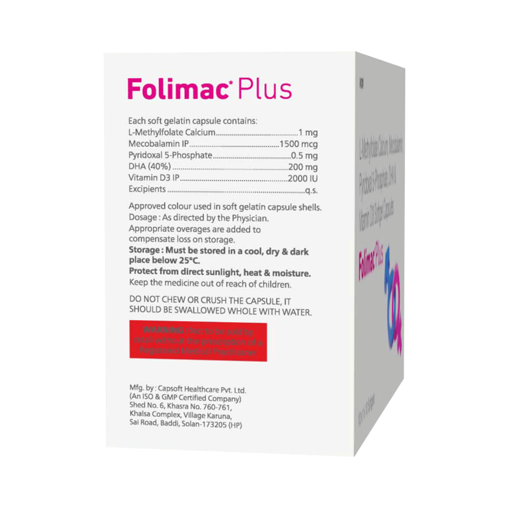 Folimac Plus Softgel Capsule is a combination of five medicines : L-Methyl Folate, Methylcobalamin, Pyridoxal-5-phosphate, Vitamin D3, and Docosahexanoic acid (DHA). L-methylfolate is the primary biologically active isomer of folic acid and the primary form of folate in circulation. Folic Acid is a form of vitamin B. It plays a vital role in the formation of red blood cells, which carry oxygen throughout the body. It is also essential in pregnancy due to its role in the development of the unborn baby's brain and spinal cord. Methylcobalamin is a form of vitamin B12 that restores its level in the body thereby helping in treating certain anemias and nerve problems. Pyridoxal-5-phosphate is a nutritional supplement that provides essential nutrients to our body and improves overall health. Vitamin D3 is a form of vitamin D. It raises vitamin D levels in your blood. This in turn raises calcium levels in your blood by helping you absorb more calcium from food. Docosahexaenoic acid (DHA) belongs to the class of medications called nutritional supplements. DHA plays a vital role in brain development. DHA decreases cholesterol and triglyceride levels, inhibits platelet aggregation and oxidation of LDL, decreases the synthesis of inflammatory markers such as prostaglandins. Overall, DHA plays a vital role in reducing the heart and circulatory disease risks.