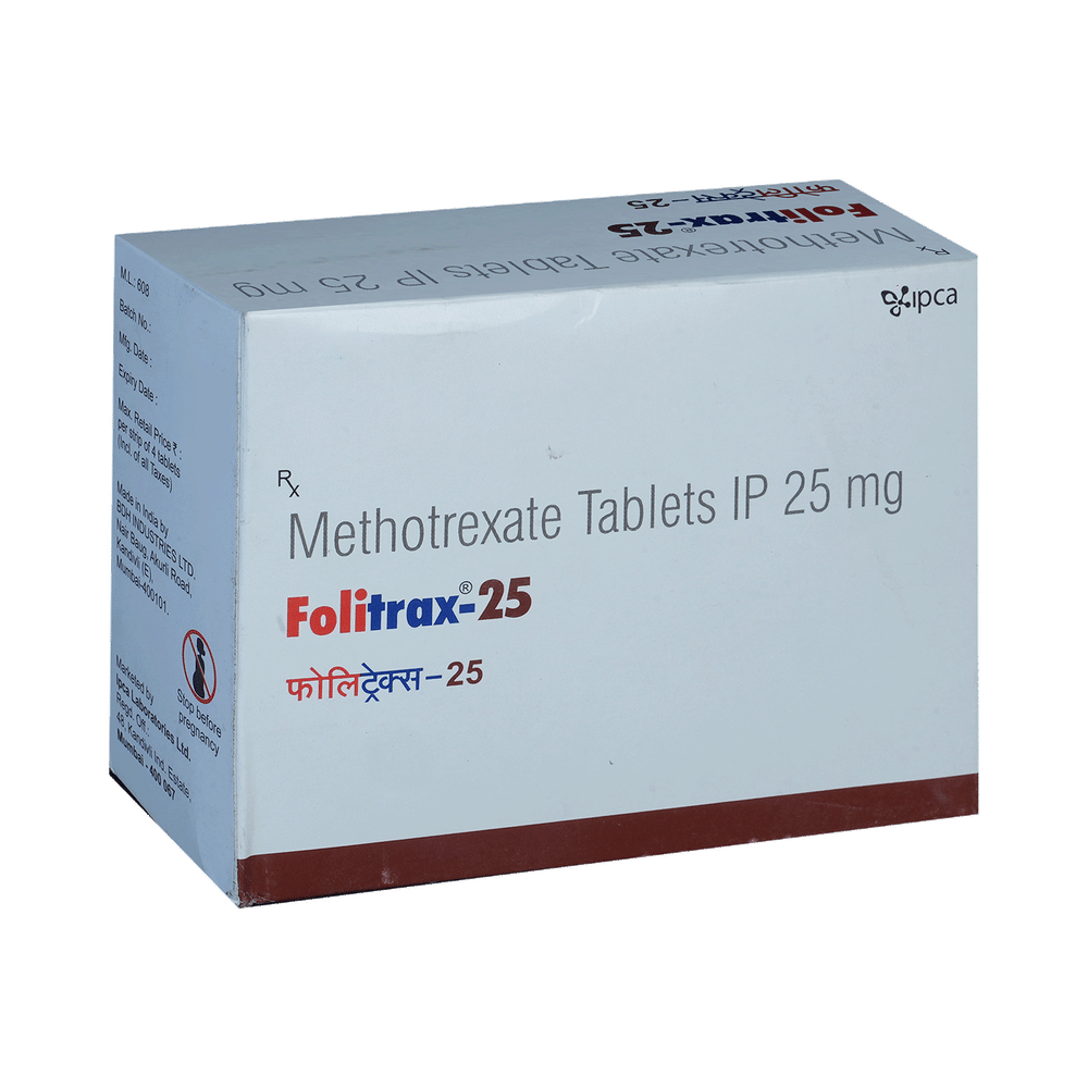 Folitrax 25 Tablet is a medicine used for the treatment of cancer in various parts of the body. It is also used to treat rheumatoid arthritis, severe and uncontrolled psoriasis, and Crohn’s disease. It works by slowing the growth of abnormal cells and reducing immune system activity in autoimmune conditions. Folitrax 25 Tablet may be used alone or in combination with other medicines. You should take it exactly as your doctor has advised. Taking too much of it can cause serious side effects. It may take several weeks or months for you to see or feel the benefits, but do not stop taking it unless your doctor tells you to.The most common side effects of this medicine are ulcerative stomatitis, hair loss, low blood cell count, increased liver enzymes, nausea, and abdominal distress. Your doctor may advise you to take folic acid to reduce some of these. If they do not go away or get worse, tell your doctor. There may be ways of preventing or reducing these effects.Folitrax 25 Tablet may lower your ability to fight infections and lead to problems with your blood, liver, or kidneys. Your doctor may perform several tests, such as blood tests, X-rays, and physical examinations, both before and during the treatment with this medicine to check for these problems.Before taking it, tell your doctor if you have problems related to the stomach, liver, or kidneys, or are taking any medicines to treat infections. Many other medicines can affect or be affected by this medicine, so let your doctor know about all your medications. This medicine is not recommended during pregnancy or while breastfeeding, as it may harm the baby. You should avoid consuming alcohol while taking this medicine, as it may increase your risk of liver damage.