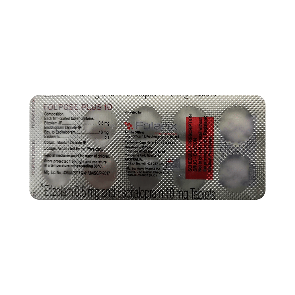 Folpose Plus 10 Tablet is a prescription medicine used to treat depression. It is a combination medicine that calms the brain by decreasing the abnormal and excessive activity of the nerve cells. It also increases the level of chemical messenger in the brain which improves mood. Folpose Plus 10 Tablet can be taken with or without food. However, it is advised to take it at the same time each day as this helps to maintain a consistent level of medicine in the body. Take this medicine in the dose and duration advised by your doctor as it has habit-forming potential. If you miss a dose of this medicine, take it as soon as you remember. Finish the full course of treatment even if you feel better. It is important not to stop taking this medicine suddenly as this may cause withdrawal symptoms.Some common side effects of this medicine include nausea, vomiting, diarrhea, confusion, memory impairment, low sexual desire, and delayed ejaculation. It may also cause dizziness and sleepiness. So, do not drive or do anything that requires mental focus until you know how this medicine affects you. Remember to inform your doctor if you develop any unusual changes in mood as it can cause suicidal thoughts and can be dangerous for you. This medicine may cause weight gain and to control it, you should have a balanced diet and exercise regularly.Take caution while taking medicine if you are suffering from liver disease. Your doctor should also know about all other medicines you are taking as many of these may make this medicine less effective or change the way it works. Inform your doctor if you are pregnant, planning pregnancy or breastfeeding.