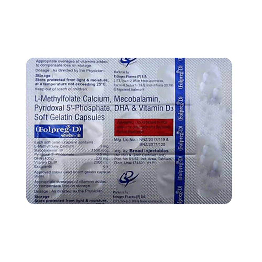 Folpreg-D Soft Gelatin Capsule is a combination of five medicines : L-Methyl Folate, Methylcobalamin, Pyridoxal-5-phosphate, Vitamin D3, and Docosahexanoic acid (DHA). L-methylfolate is the primary biologically active isomer of folic acid and the primary form of folate in circulation. Folic Acid is a form of vitamin B. It plays a vital role in the formation of red blood cells, which carry oxygen throughout the body. It is also essential in pregnancy due to its role in the development of the unborn baby's brain and spinal cord. Methylcobalamin is a form of vitamin B12 that restores its level in the body thereby helping in treating certain anemias and nerve problems. Pyridoxal-5-phosphate is a nutritional supplement that provides essential nutrients to our body and improves overall health. Vitamin D3 is a form of vitamin D. It raises vitamin D levels in your blood. This in turn raises calcium levels in your blood by helping you absorb more calcium from food. Docosahexaenoic acid (DHA) belongs to the class of medications called nutritional supplements. DHA plays a vital role in brain development. DHA decreases cholesterol and triglyceride levels, inhibits platelet aggregation and oxidation of LDL, decreases the synthesis of inflammatory markers such as prostaglandins. Overall, DHA plays a vital role in reducing the heart and circulatory disease risks.