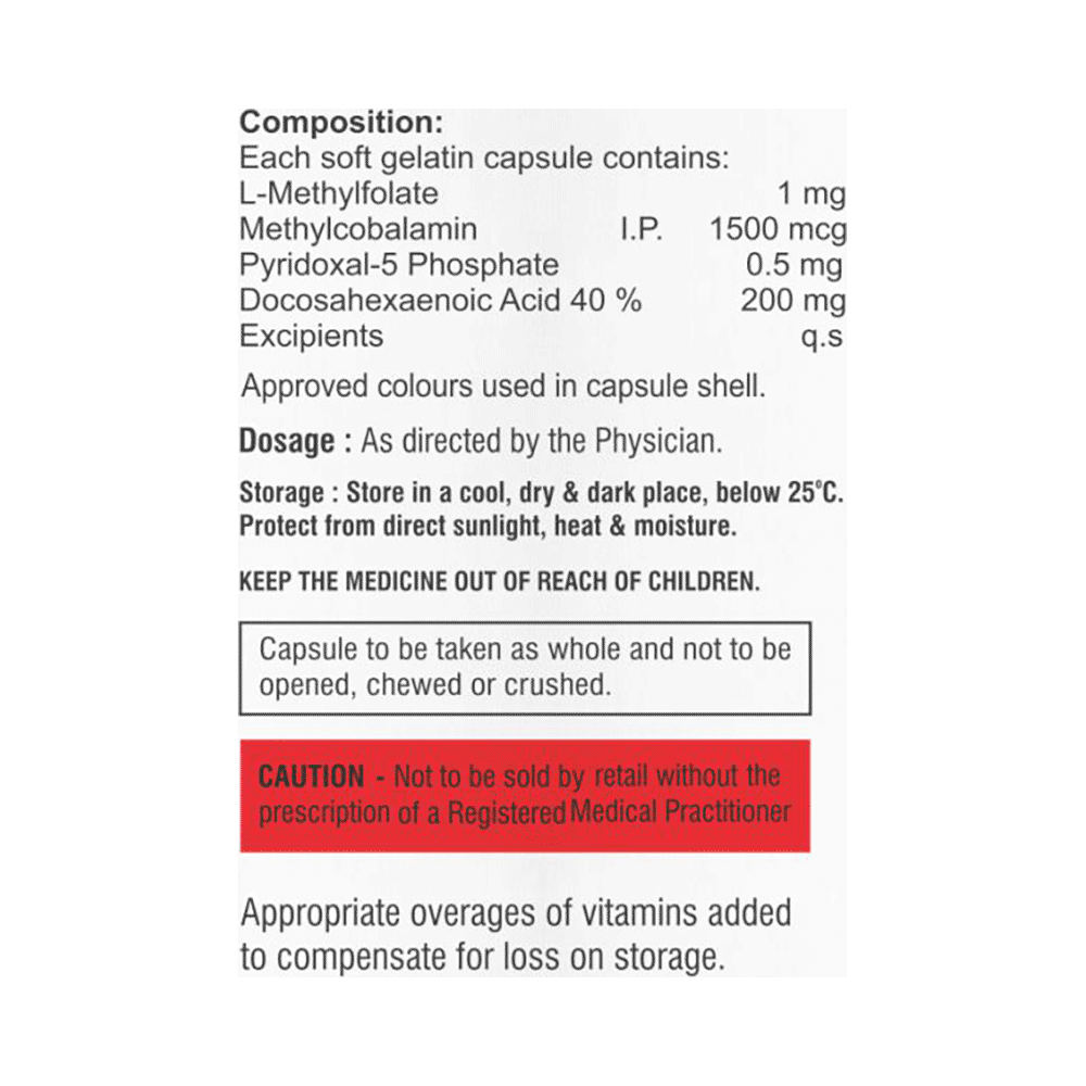 Salt Composition: Docosahexanoic acid(DHA) (200mg) + Pyridoxal-5-phosphate (0.5mg) + Methylcobalamin (1500mcg) + L-Methyl Folate (1mg)