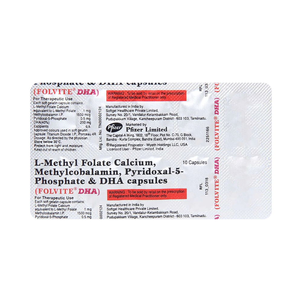 Folvite DHA Soft Gelatin Capsule is a combination of four medicines : Docosahexanoic acid(DHA), Pyridoxal-5-phosphate, Methylcobalamin, and L-Methyl Folate. Docosahexaenoic acid (DHA) belongs to the class of medications called nutritional supplements. DHA plays a vital role in brain development. DHA decreases cholesterol and triglyceride levels, inhibits platelet aggregation and oxidation of LDL, decreases the synthesis of inflammatory markers such as prostaglandins. Overall, DHA plays a vital role in reducing the heart and circulatory disease risks. Pyridoxal-5-phosphate is a nutritional supplement that provides essential nutrients to our body and improves overall health. Methylcobalamin is a form of vitamin B12 that restores its level in the body thereby helping in treating certain anemias and nerve problems. L-methylfolate is the primary biologically active isomer of folic acid and the primary form of folate in circulation. Folic Acid is a form of vitamin B. It plays a vital role in the formation of red blood cells, which carry oxygen throughout the body. It is also essential in pregnancy due to its role in the development of the unborn baby's brain and spinal cord.