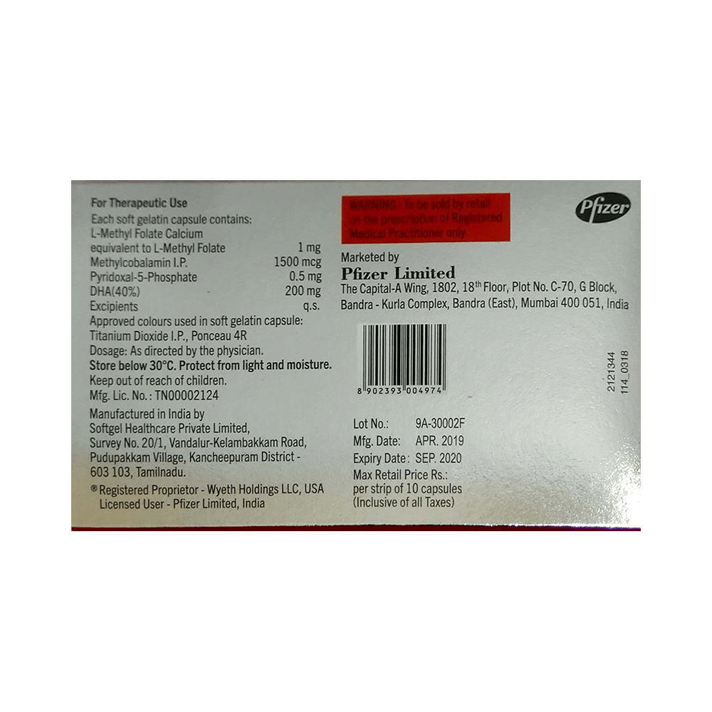Salt Composition: Docosahexanoic acid(DHA) (200mg) + Pyridoxal-5-phosphate (0.5mg) + Methylcobalamin (1500mcg) + L-Methyl Folate (1mg)