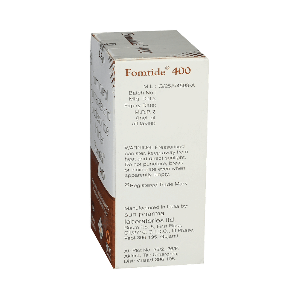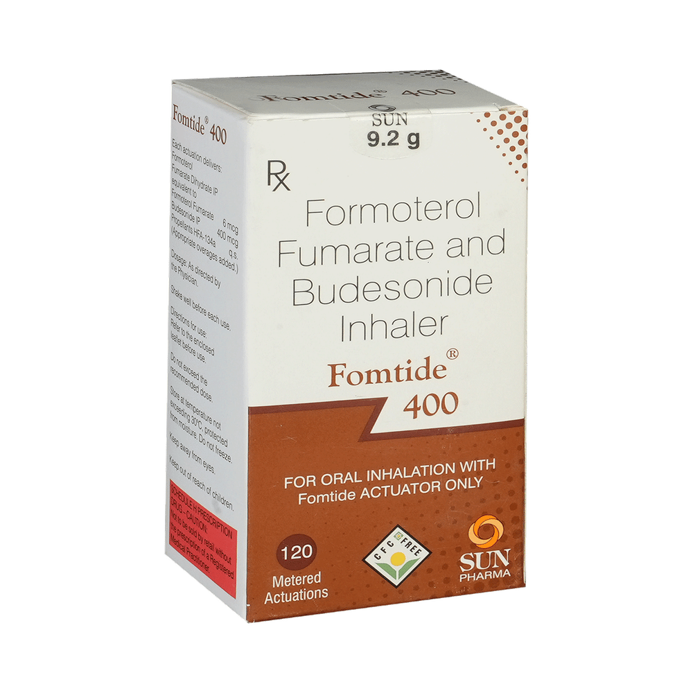 FOMtide 400 CFC Free Inhaler is a combination of two medicines in one inhaler. It relieves the long-term symptoms of asthma and COPD, making breathing easier. It works by inhibiting the release of certain chemical messengers that cause inflammation (swelling) and relaxes the muscles in the airways. Your doctor will tell you how often you need to use your inhaler. The effect of this medicine may be noticeable after a few days but will only reach its maximum after a few weeks. This medicine must be used regularly to be effective, so go on taking it even if you don't have any symptoms. That means it’s doing its job. If you stop taking it your symptoms may get worse. This medicine should not be used to relieve sudden shortness of breath. If sudden shortness of breath occurs, use your rescue inhaler. To get the benefit from this medicine you need to make sure you get your inhaler technique right, otherwise, it does not work as well.The most common side effects include headache, nausea, vomiting, stomach discomfort, and respiratory tract infection. If you get there, don’t stop taking it but do talk to your doctor. You can prevent some of these symptoms by rinsing your mouth and throat with water or brushing your teeth after using your inhaler. There are other, rarer side effects which can be serious. Talk to your doctor if you're worried about them.Before taking it, you should tell your doctor if you have any kidney or liver diseases so that your doctor can prescribe a suitable dose for you. You should also tell your doctor if you are pregnant, planning pregnancy or breastfeeding.
