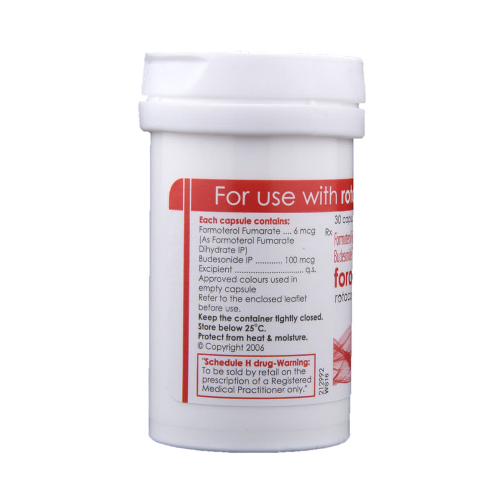 In Treatment of Chronic obstructive pulmonary disease (COPD)FORAcort 100 Rotacap helps the airways in your lungs stay open. It relaxes the muscles of these airways. This makes it easier for air to get in and out. It will relieve symptoms such as tightness in your chest, shortness of breath, wheezing and coughing and help you carry out your daily activities more easily. This medicine is safe and effective. It usually starts to work within a few minutes and the effects can last up to several hours. Do not stop using it unless you are advised to by your doctor.In Treatment and prevention of AsthmaFORAcort 100 Rotacap can help prevent the onset of an asthma attack if it is taken before exercise or exposure to some “triggersâ€. These may include house dust, pollen, pets and cigarette smoke. This medicine will allow you to exercise more freely without worrying about getting symptoms such as wheezing, coughing and shortness of breath. It allows you to live your life more freely without worrying so much about things that set off your symptoms.show moreshow less