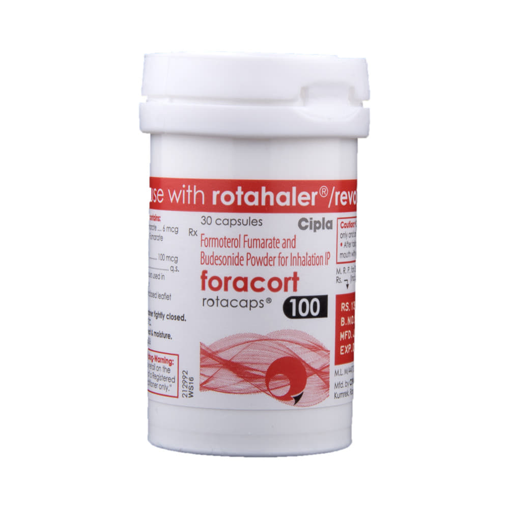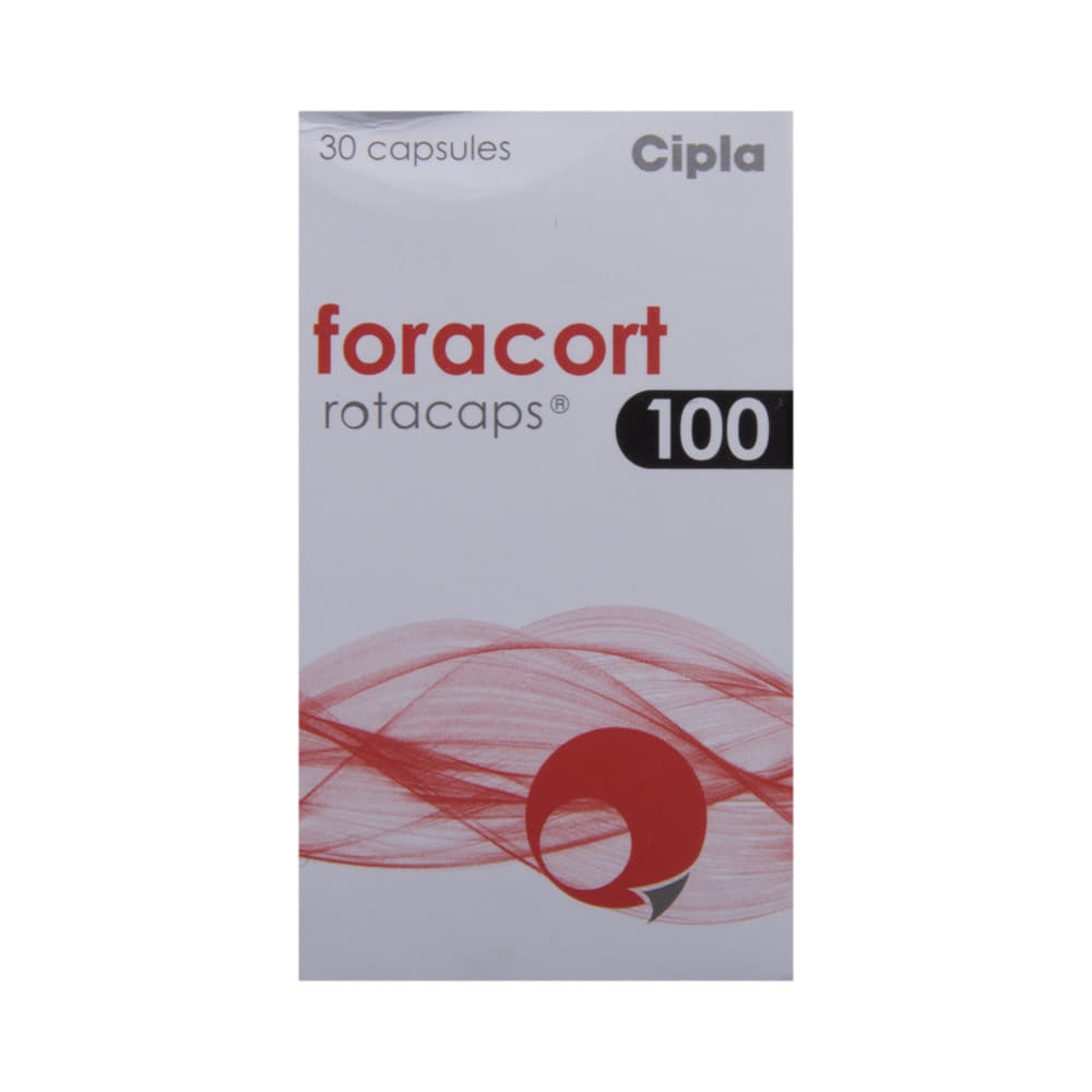 FORAcort 100 Rotacap is a combination of two medicines in one inhaler. It relieves the long-term symptoms of asthma and COPD, making breathing easier. It works by inhibiting the release of certain chemical messengers that cause inflammation (swelling) and relaxes the muscles in the airways. Your doctor will tell you how often you need to use your inhaler. The effect of this medicine may be noticeable after a few days but will only reach its maximum after a few weeks. This medicine must be used regularly to be effective, so go on taking it even if you don't have any symptoms. That means it’s doing its job. If you stop taking it your symptoms may get worse. This medicine should not be used to relieve sudden shortness of breath. If sudden shortness of breath occurs, use your rescue inhaler. To get the benefit from this medicine you need to make sure you get your inhaler technique right, otherwise, it does not work as well.The most common side effects include headache, nausea, vomiting, stomach discomfort, and respiratory tract infection. If you get there, don’t stop taking it but do talk to your doctor. You can prevent some of these symptoms by rinsing your mouth and throat with water or brushing your teeth after using your inhaler. There are other, rarer side effects which can be serious. Talk to your doctor if you're worried about them.Before taking it, you should tell your doctor if you have any kidney or liver diseases so that your doctor can prescribe a suitable dose for you. You should also tell your doctor if you are pregnant, planning pregnancy or breastfeeding.
