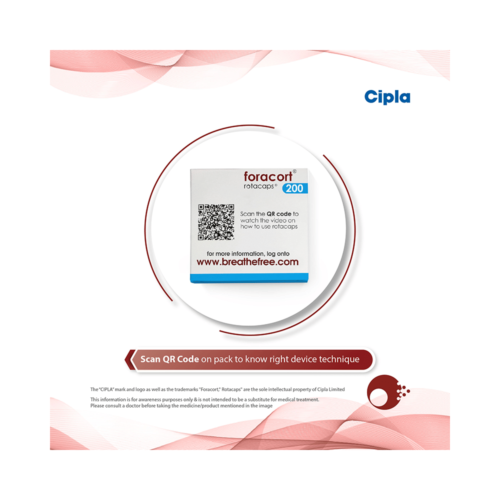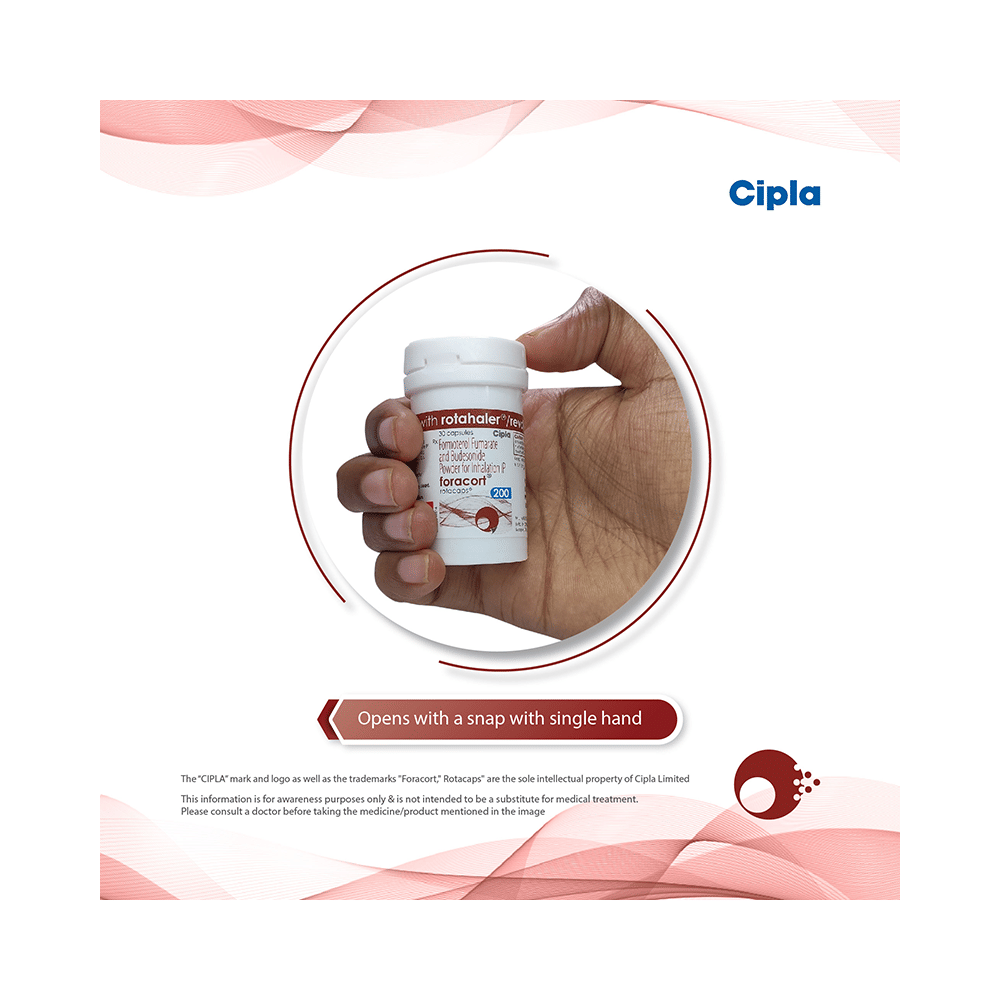 FORAcort 200 Rotacap is a combination of two medicines in one inhaler. It relieves the long-term symptoms of asthma and COPD, making breathing easier. It works by inhibiting the release of certain chemical messengers that cause inflammation (swelling) and relaxes the muscles in the airways. Your doctor will tell you how often you need to use your inhaler. The effect of this medicine may be noticeable after a few days but will only reach its maximum after a few weeks. This medicine must be used regularly to be effective, so go on taking it even if you don't have any symptoms. That means it’s doing its job. If you stop taking it your symptoms may get worse. This medicine should not be used to relieve sudden shortness of breath. If sudden shortness of breath occurs, use your rescue inhaler. To get the benefit from this medicine you need to make sure you get your inhaler technique right, otherwise, it does not work as well.The most common side effects include headache, nausea, vomiting, stomach discomfort, and respiratory tract infection. If you get there, don’t stop taking it but do talk to your doctor. You can prevent some of these symptoms by rinsing your mouth and throat with water or brushing your teeth after using your inhaler. There are other, rarer side effects which can be serious. Talk to your doctor if you're worried about them.Before taking it, you should tell your doctor if you have any kidney or liver diseases so that your doctor can prescribe a suitable dose for you. You should also tell your doctor if you are pregnant, planning pregnancy or breastfeeding.