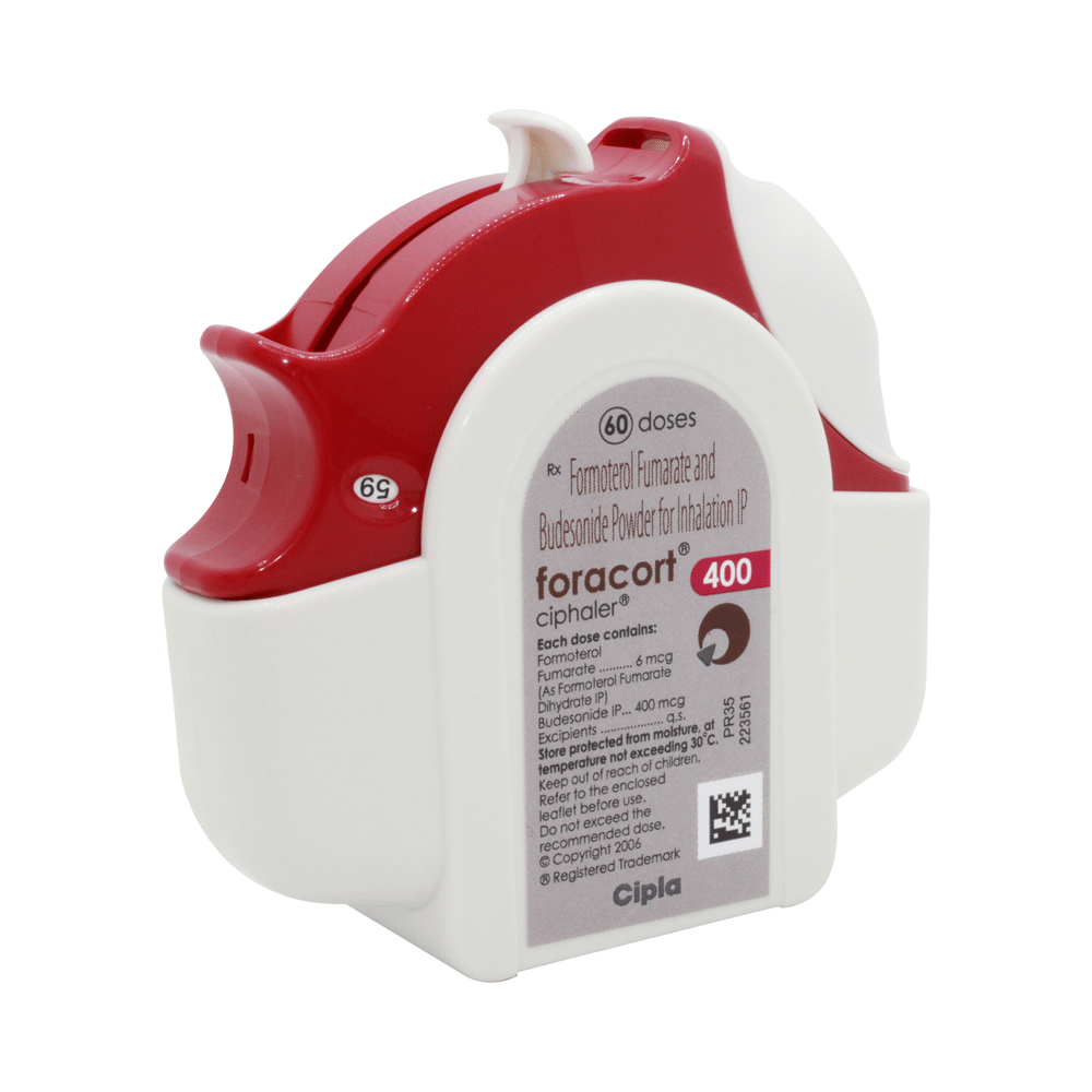 FORAcort 400 Ciphaler is a combination of two medicines in one inhaler. It relieves the long-term symptoms of asthma and COPD, making breathing easier. It works by inhibiting the release of certain chemical messengers that cause inflammation (swelling) and relaxes the muscles in the airways. Your doctor will tell you how often you need to use your inhaler. The effect of this medicine may be noticeable after a few days but will only reach its maximum after a few weeks. This medicine must be used regularly to be effective, so go on taking it even if you don't have any symptoms. That means it’s doing its job. If you stop taking it your symptoms may get worse. This medicine should not be used to relieve sudden shortness of breath. If sudden shortness of breath occurs, use your rescue inhaler. To get the benefit from this medicine you need to make sure you get your inhaler technique right, otherwise, it does not work as well.The most common side effects include headache, nausea, vomiting, stomach discomfort, and respiratory tract infection. If you get there, don’t stop taking it but do talk to your doctor. You can prevent some of these symptoms by rinsing your mouth and throat with water or brushing your teeth after using your inhaler. There are other, rarer side effects which can be serious. Talk to your doctor if you're worried about them.Before taking it, you should tell your doctor if you have any kidney or liver diseases so that your doctor can prescribe a suitable dose for you. You should also tell your doctor if you are pregnant, planning pregnancy or breastfeeding.