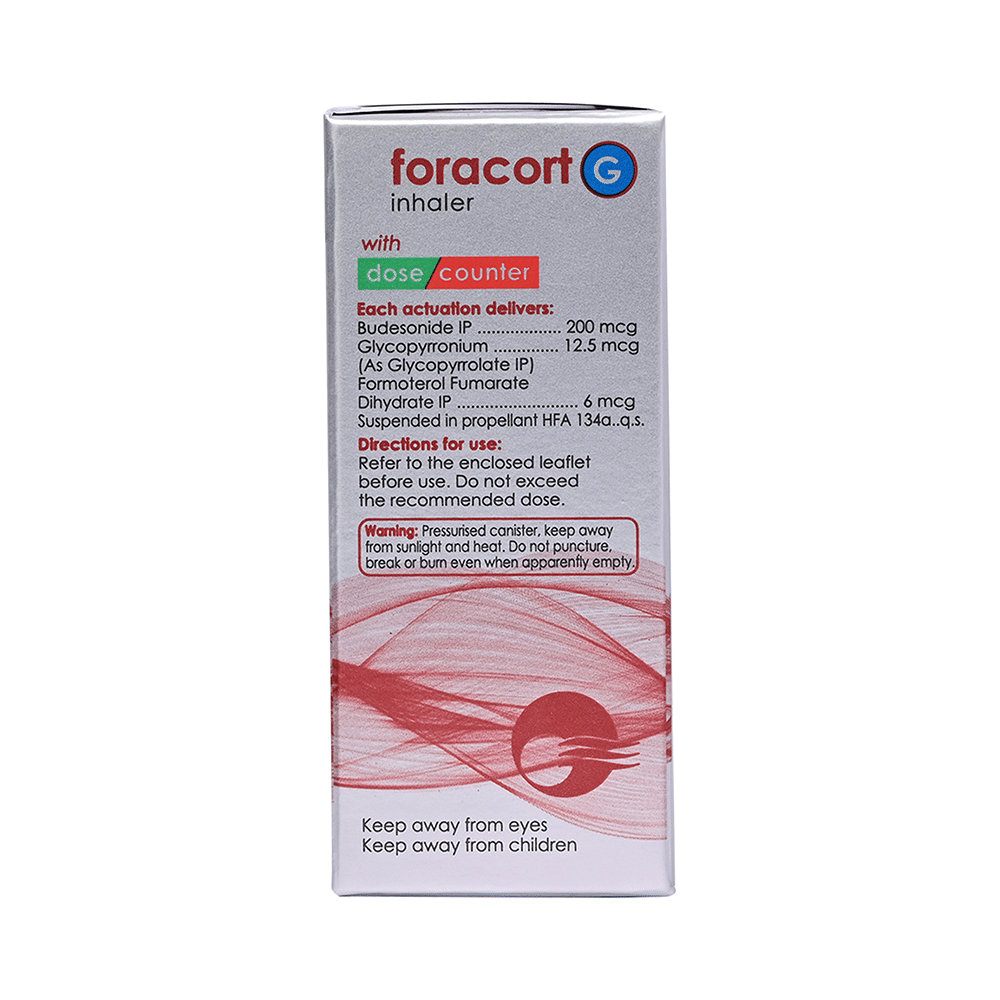 Foracort G Inhaler is a combination of three medicines. It is used in the treatment of chronic obstructive pulmonary disease (COPD). It works in various ways and reduces the symptoms of the disease such as coughing, chest tightness, and shortness of breath. Foracort G Inhaler should be used in the dose and duration as prescribed by your doctor. Use it regularly and as long as your doctor has prescribed it to get maximum benefits from the medicine. Don’t stop using the medicine even if you feel better unless your doctor tells you to. If you stop, your breathing problems could get worse.Foracort G Inhaler is generally safe and effective but some common side effects include dizziness, headache, vomiting, and stuffy nose (nasal congestion). These side effects are usually mild and should gradually improve as your body gets used to this medicine. Let your doctor know if you are bothered by any of this, or if you experience any other side effects which you think are caused by the medicine.Before using Foracort G Inhaler, let your doctor know if you have any preexisting medical conditions. Let your doctor also know all the other medicines you are taking. Additionally, to make sure it is safe for you, tell your doctor if you are pregnant or breastfeeding before taking this medicine. You shouldn’t smoke while on treatment with this medicine. Smoking causes damage to your lungs and will make your condition worse.