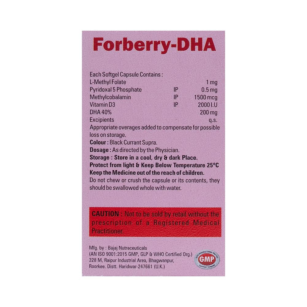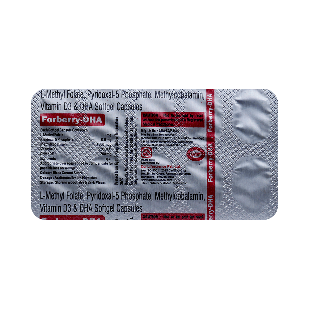 Forberry-DHA Softgel Capsule is a combination of five medicines : L-Methyl Folate, Methylcobalamin, Pyridoxal-5-phosphate, Vitamin D3, and Docosahexanoic acid (DHA). L-methylfolate is the primary biologically active isomer of folic acid and the primary form of folate in circulation. Folic Acid is a form of vitamin B. It plays a vital role in the formation of red blood cells, which carry oxygen throughout the body. It is also essential in pregnancy due to its role in the development of the unborn baby's brain and spinal cord. Methylcobalamin is a form of vitamin B12 that restores its level in the body thereby helping in treating certain anemias and nerve problems. Pyridoxal-5-phosphate is a nutritional supplement that provides essential nutrients to our body and improves overall health. Vitamin D3 is a form of vitamin D. It raises vitamin D levels in your blood. This in turn raises calcium levels in your blood by helping you absorb more calcium from food. Docosahexaenoic acid (DHA) belongs to the class of medications called nutritional supplements. DHA plays a vital role in brain development. DHA decreases cholesterol and triglyceride levels, inhibits platelet aggregation and oxidation of LDL, decreases the synthesis of inflammatory markers such as prostaglandins. Overall, DHA plays a vital role in reducing the heart and circulatory disease risks.