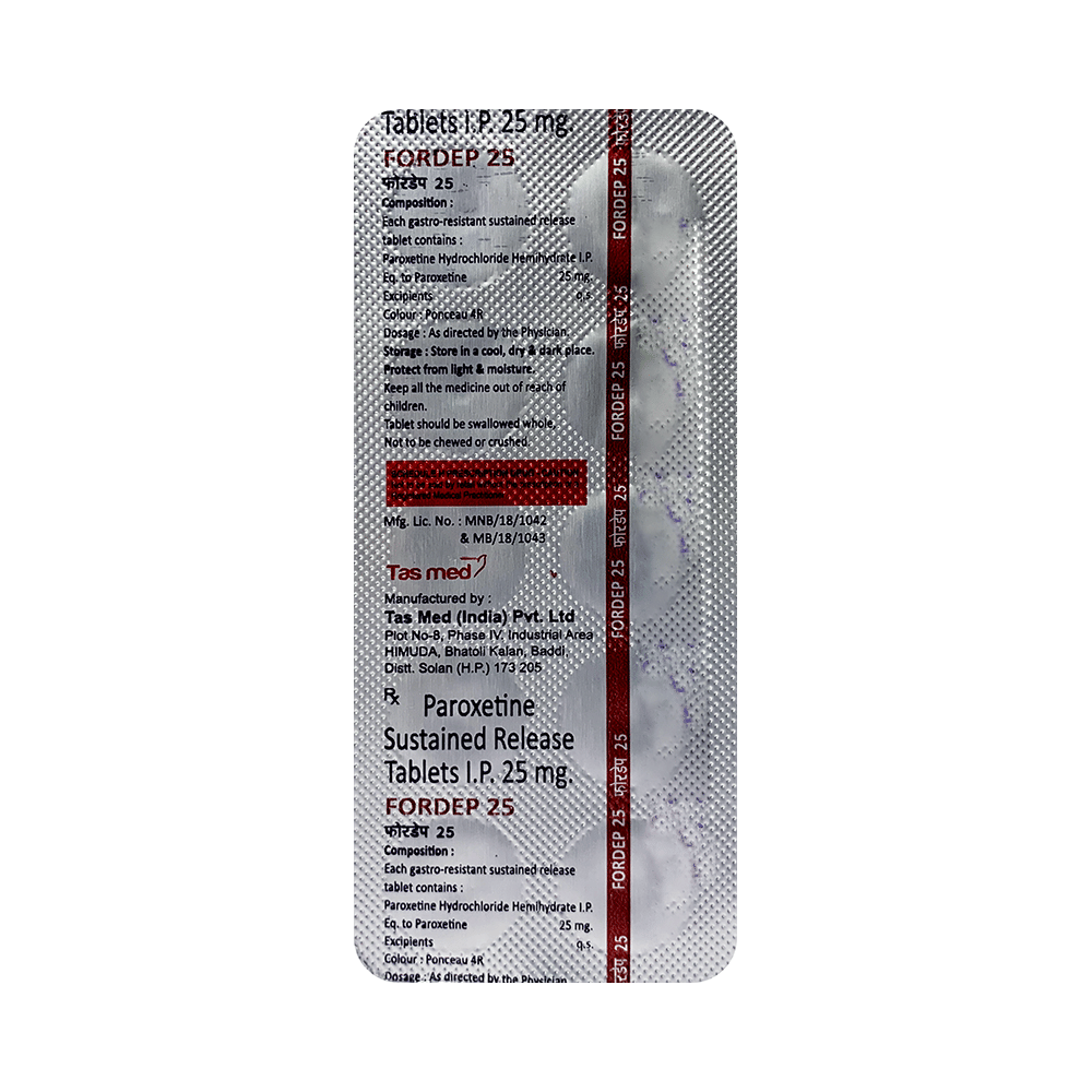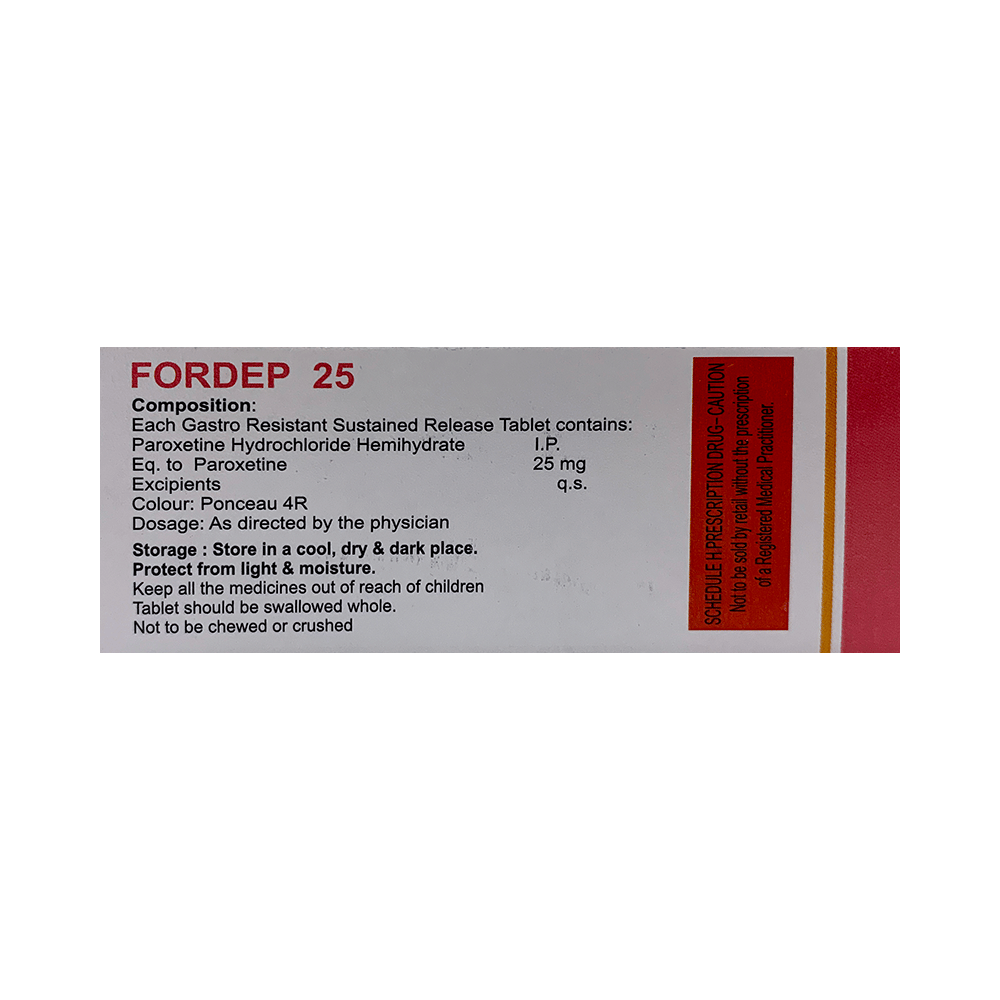 Fordep 25 Tablet SR is a type of antidepressant belonging to the selective serotonin reuptake inhibitor (SSRI) group of medicines. It is widely prescribed to treat depression and anxiety-related conditions like obsessive-compulsive disorder, and panic disorder. Fordep 25 Tablet SR helps many people to recover from depression by improving their mood and relieving anxiety and tension. It can be taken with or without food. The dose and how often you need it will be decided by your doctor so that you get the right amount to control your symptoms.Your doctor may start you on a lower dose and increase it gradually. Do not change the dose or stop taking it without talking to your doctor, even if you feel well. Doing so may make your condition worse or you may suffer from unpleasant withdrawal symptoms (anxiety, restlessness, palpitations, dizziness, sleep disturbances, etc).To get the most benefit, take this medicine regularly at the same time each day. Your doctor may advise you to take it in the morning if you have trouble sleeping. It may take a few weeks before you start feeling better. Let your doctor know if you do not see any improvement even after 4 weeks.Some common side effects of Fordep 25 Tablet SR include nausea, fatigue, dry mouth, loss of appetite, increased sweating, dizziness, nervousness, tremors, insomnia (difficulty in sleeping), and constipation. Sexual side effects like decreased sexual drive, delayed ejaculation, and erectile dysfunction may also be seen. Let your doctor know straight away if you develop any sudden worsening of mood or any thoughts about harming yourself.Before taking this medicine, you should tell your doctor if you have epilepsy (seizure disorder or fits), diabetes, liver or kidney disease, heart problems, or glaucoma. These may affect your treatment. Pregnant or breastfeeding women should also consult their doctor before taking it. Some other medicines may affect the way it works, especially other antidepressants and medicines called MAO inhibitors. Please tell your doctor about all the medicines you are taking to make sure you are safe.