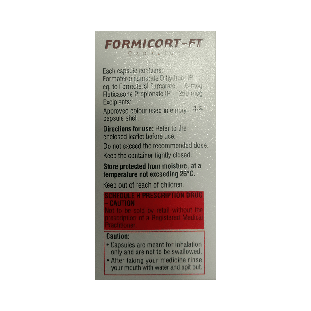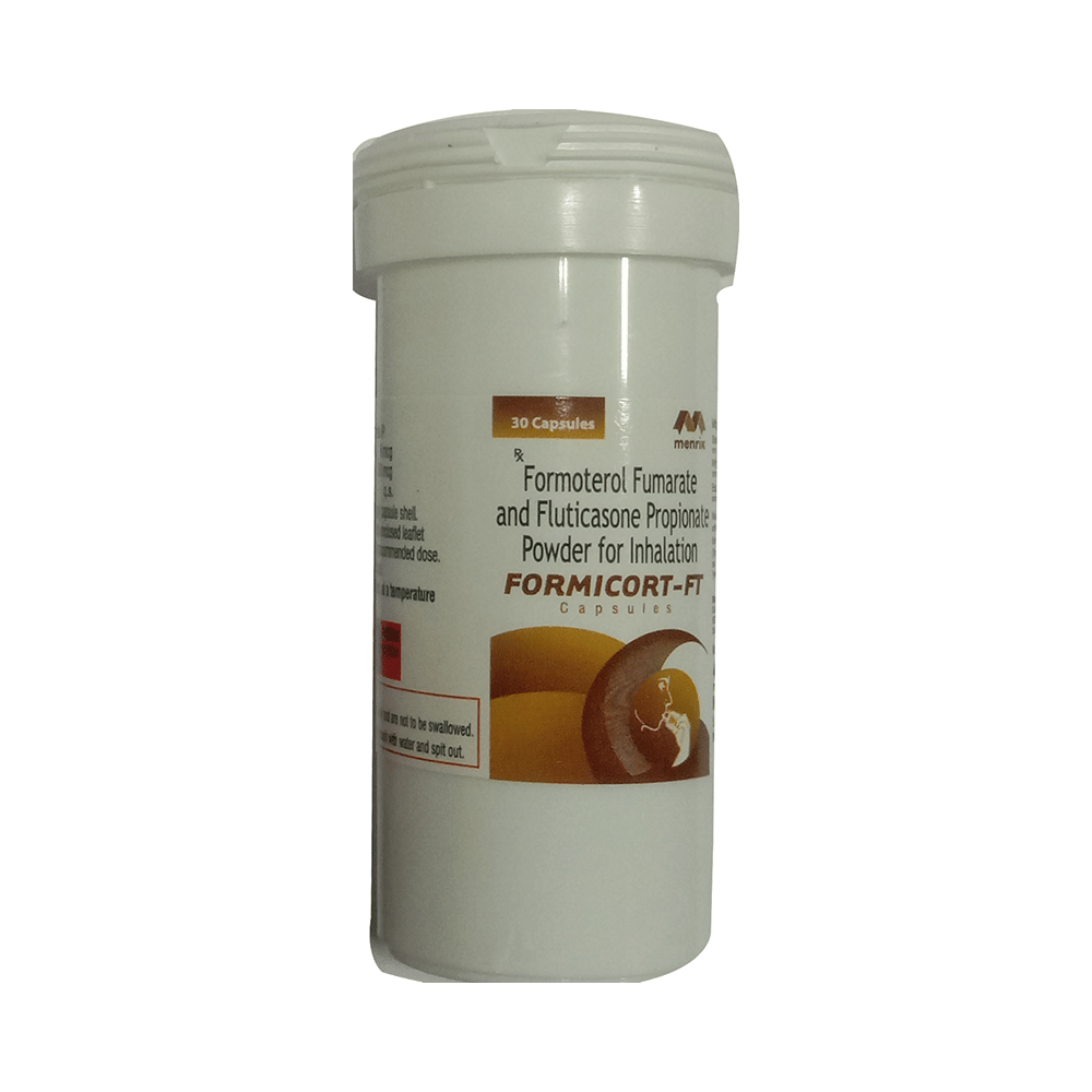 Formicort-FT Capsule is used in the treatment of asthma (wheezing and shortness of breath) and chronic obstructive pulmonary disorder (a lung disorder in which the flow of air to the lungs is blocked). It relaxes the muscles of the air passages and making it easier to breathe. Your doctor will tell you how often you need to use your inhaler. It’s important that you take the lowest dose needed to effectively control your asthma. The effect of this medicine may be noticeable after a few days but will only reach its maximum after a few weeks. This medicine must be used regularly to be effective, so go on taking it even if you don't have any symptoms. That means it’s doing its job. If you stop taking it your asthma and COPD may get worse. It should not be used to relieve sudden asthma attacks. If an asthma attack occurs, use your quick-relief inhaler (reliever). To get the benefit from this medicine you need to make sure you get your inhaler technique right, otherwise, it Does not work as well.The most common side effects are nausea, vomiting, respiratory tract infection, headache, hoarseness of voice, sore throat, cough, musculoskeletal (bone, muscle or joint) pain, and increased heart rate. If you get there, don’t stop taking it but do talk to your doctor. You can help prevent some of these symptoms by rinsing your mouth and throat with water or brushing your teeth after using your inhaler. There are other, rarer side effects which can be serious. Talk to your doctor if you're worried about them. In general, you should be trying to avoid situations that make your asthma worse (your triggers) and try not to smoke.Ask your doctor whether it’s safe to take this medicine if you're pregnant or breastfeeding. Before taking it, you should tell your doctor if you have any kidney or liver diseases so that your doctor can prescribe a suitable dose for you.