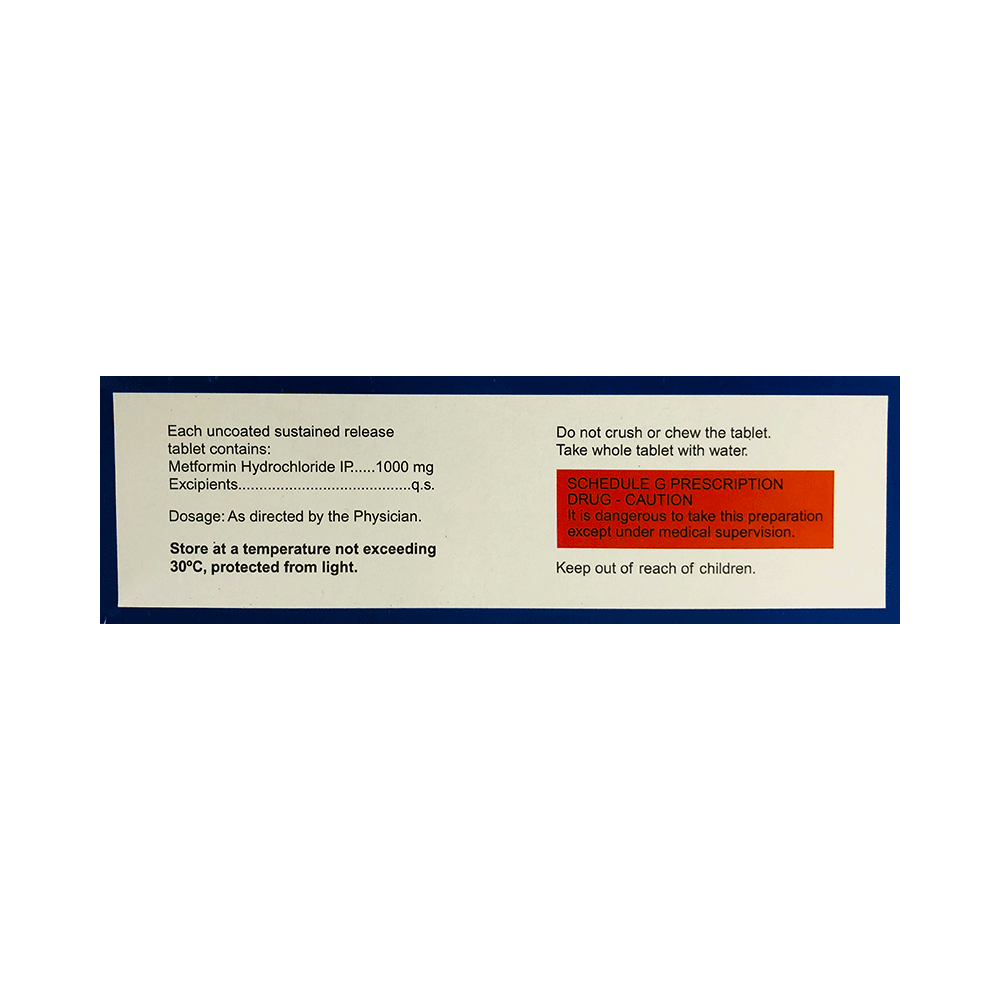 Formin-SR 1000 Tablet is a medicine used to treat type 2 diabetes mellitus. It helps control blood sugar levels and thus prevents serious complications of diabetes. It is also used to treat a menstruation-related disorder known as polycystic ovary syndrome (PCOS) in women. Formin-SR 1000 Tablet is best taken with food to avoid nausea and abdominal pain. You should take it regularly, at the same time each day, to get the most benefit. You should not stop taking this medicine unless your doctor recommends it. Your lifestyle plays a big part in controlling diabetes. Therefore, it is important to stay on the diet and exercise program recommended by your doctor while taking this medicine.The most common side effects of this medicine include diarrhea, nausea, vomiting, abdominal discomfort, headache, and loss of appetite. Some people may develop hypoglycemia (low blood sugar level) when this medicine is taken along with other antidiabetic medicines or alcohol or upon skipping a meal. Monitor your blood sugar levels regularly while taking it.Before taking this medicine, inform your doctor if you have any kidney, liver, or heart problems. Pregnant or breastfeeding women should also consult their doctor before taking it. Your doctor will check your kidney function before starting treatment with it. Avoid excessive alcohol intake while taking it, as this may increase the risk of developing some side effects.