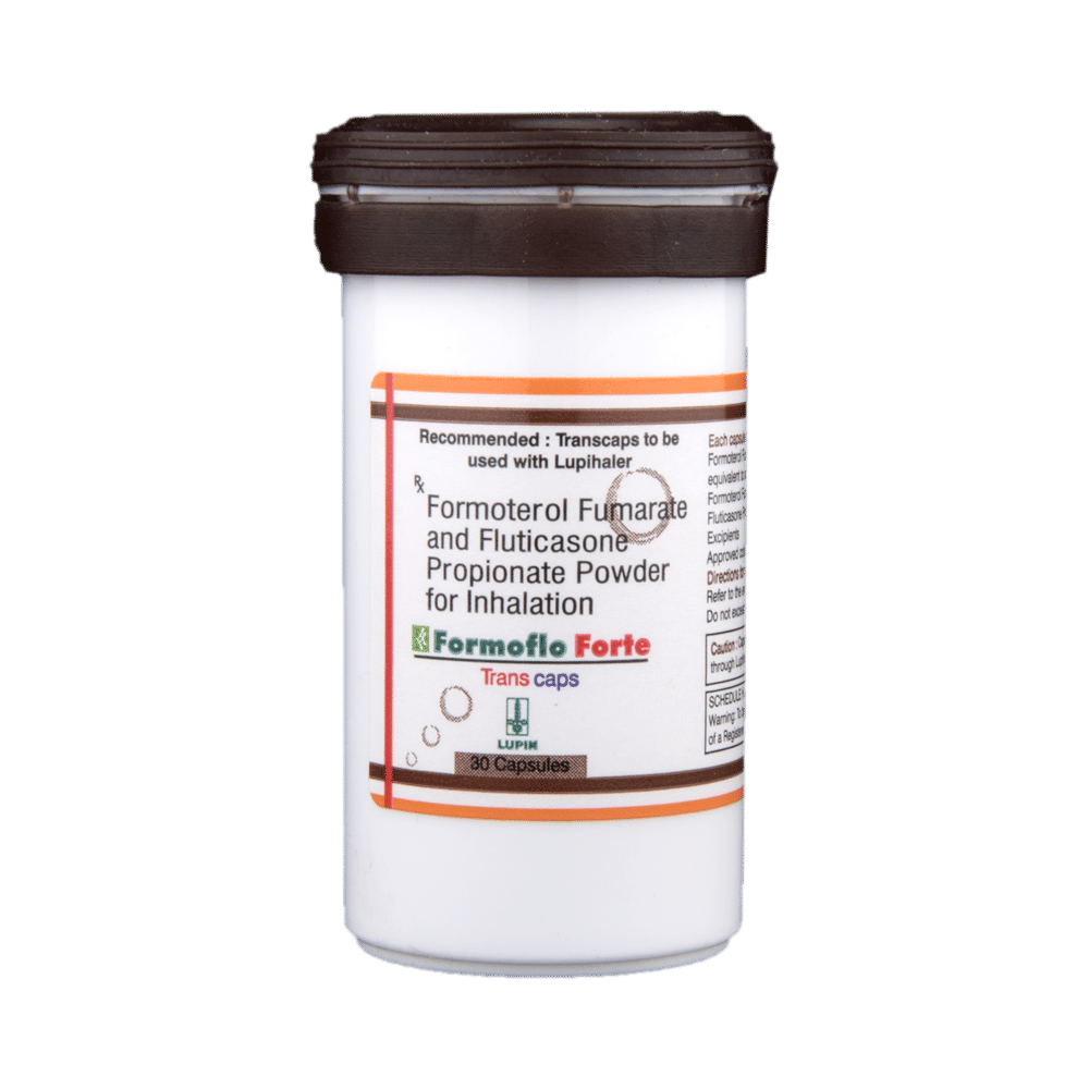 Formoflo Forte Transcaps is used in the treatment of asthma (wheezing and shortness of breath) and chronic obstructive pulmonary disorder (a lung disorder in which the flow of air to the lungs is blocked). It relaxes the muscles of the air passages and making it easier to breathe. Your doctor will tell you how often you need to use your inhaler. It’s important that you take the lowest dose needed to effectively control your asthma. The effect of this medicine may be noticeable after a few days but will only reach its maximum after a few weeks. This medicine must be used regularly to be effective, so go on taking it even if you don't have any symptoms. That means it’s doing its job. If you stop taking it your asthma and COPD may get worse. It should not be used to relieve sudden asthma attacks. If an asthma attack occurs, use your quick-relief inhaler (reliever). To get the benefit from this medicine you need to make sure you get your inhaler technique right, otherwise, it Does not work as well.The most common side effects are nausea, vomiting, respiratory tract infection, headache, hoarseness of voice, sore throat, cough, musculoskeletal (bone, muscle or joint) pain, and increased heart rate. If you get there, don’t stop taking it but do talk to your doctor. You can help prevent some of these symptoms by rinsing your mouth and throat with water or brushing your teeth after using your inhaler. There are other, rarer side effects which can be serious. Talk to your doctor if you're worried about them. In general, you should be trying to avoid situations that make your asthma worse (your triggers) and try not to smoke.Ask your doctor whether it’s safe to take this medicine if you're pregnant or breastfeeding. Before taking it, you should tell your doctor if you have any kidney or liver diseases so that your doctor can prescribe a suitable dose for you.
