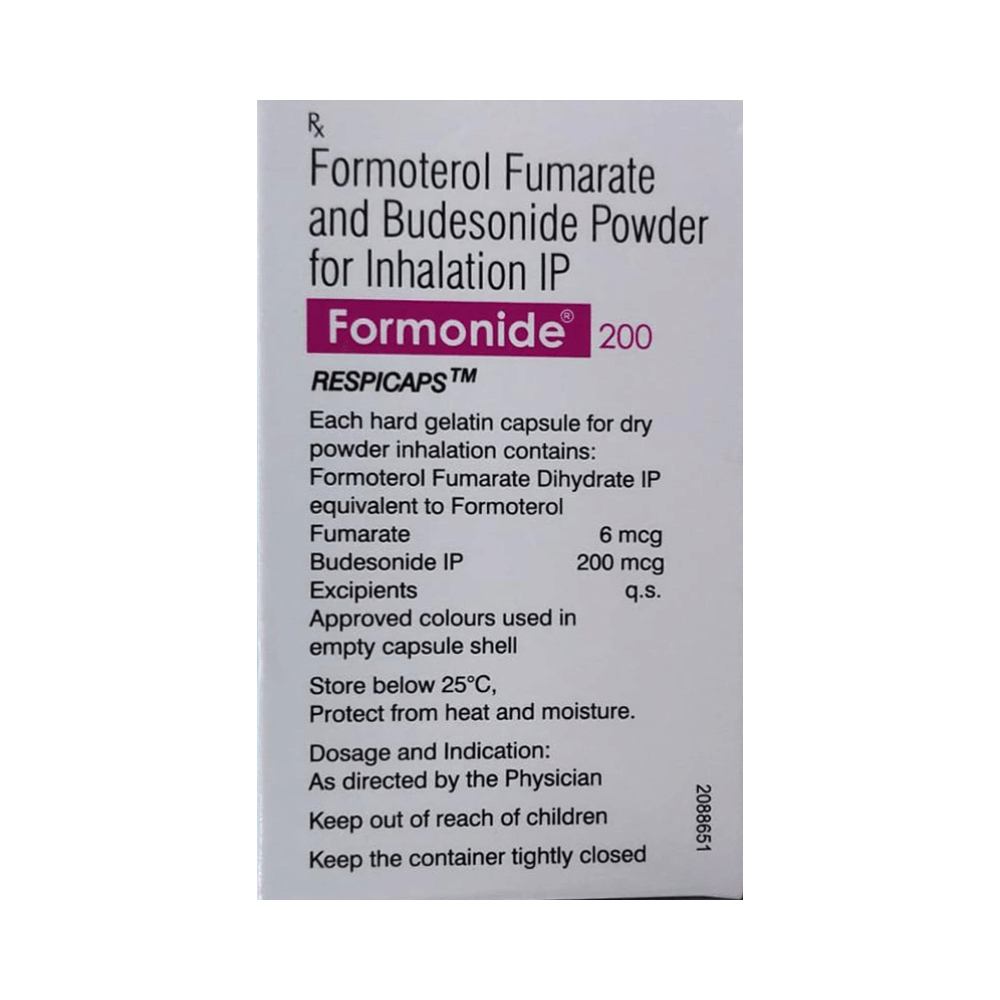 FORMOnide 200 Capsule is a combination of two medicines in one inhaler. It relieves the long-term symptoms of asthma and COPD, making breathing easier. It works by inhibiting the release of certain chemical messengers that cause inflammation (swelling) and relaxes the muscles in the airways. Your doctor will tell you how often you need to use your inhaler. The effect of this medicine may be noticeable after a few days but will only reach its maximum after a few weeks. This medicine must be used regularly to be effective, so go on taking it even if you don't have any symptoms. That means it’s doing its job. If you stop taking it your symptoms may get worse. This medicine should not be used to relieve sudden shortness of breath. If sudden shortness of breath occurs, use your rescue inhaler. To get the benefit from this medicine you need to make sure you get your inhaler technique right, otherwise, it does not work as well.The most common side effects include headache, nausea, vomiting, stomach discomfort, and respiratory tract infection. If you get there, don’t stop taking it but do talk to your doctor. You can prevent some of these symptoms by rinsing your mouth and throat with water or brushing your teeth after using your inhaler. There are other, rarer side effects which can be serious. Talk to your doctor if you're worried about them.Before taking it, you should tell your doctor if you have any kidney or liver diseases so that your doctor can prescribe a suitable dose for you. You should also tell your doctor if you are pregnant, planning pregnancy or breastfeeding.