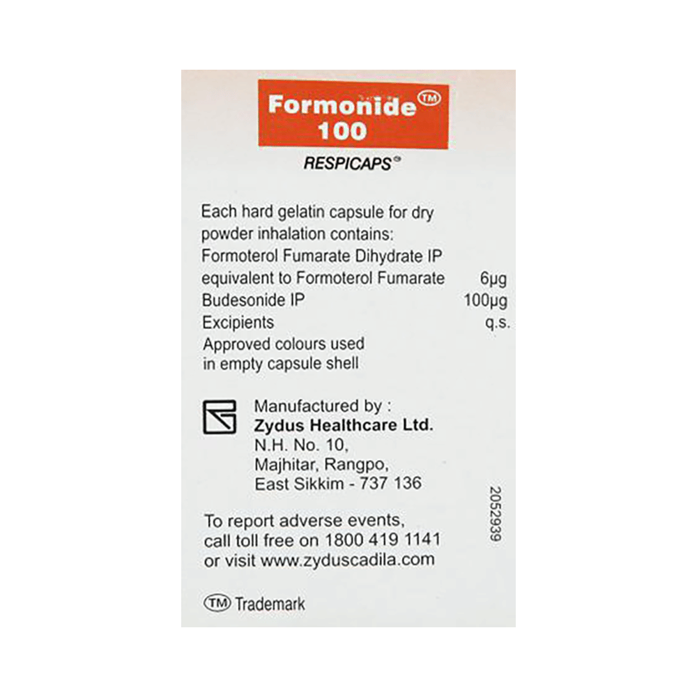 FORMOnide 6mcg/100mcg Respicap is a combination of two medicines in one inhaler. It relieves the long-term symptoms of asthma and COPD, making breathing easier. It works by inhibiting the release of certain chemical messengers that cause inflammation (swelling) and relaxes the muscles in the airways. Your doctor will tell you how often you need to use your inhaler. The effect of this medicine may be noticeable after a few days but will only reach its maximum after a few weeks. This medicine must be used regularly to be effective, so go on taking it even if you don't have any symptoms. That means it’s doing its job. If you stop taking it your symptoms may get worse. This medicine should not be used to relieve sudden shortness of breath. If sudden shortness of breath occurs, use your rescue inhaler. To get the benefit from this medicine you need to make sure you get your inhaler technique right, otherwise, it does not work as well.The most common side effects include headache, nausea, vomiting, stomach discomfort, and respiratory tract infection. If you get there, don’t stop taking it but do talk to your doctor. You can prevent some of these symptoms by rinsing your mouth and throat with water or brushing your teeth after using your inhaler. There are other, rarer side effects which can be serious. Talk to your doctor if you're worried about them.Before taking it, you should tell your doctor if you have any kidney or liver diseases so that your doctor can prescribe a suitable dose for you. You should also tell your doctor if you are pregnant, planning pregnancy or breastfeeding.