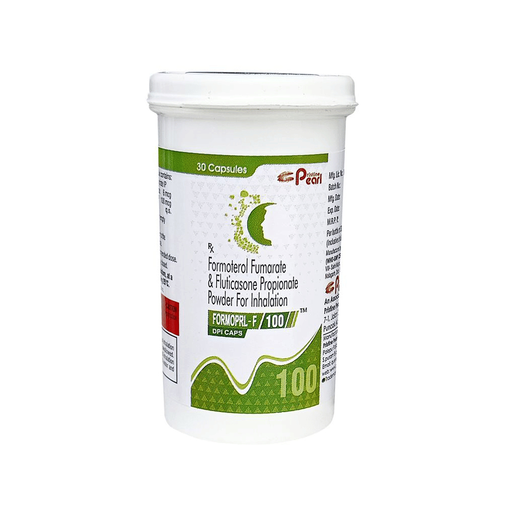 Formoprl-F 100 Dpi Caps is used in the treatment of asthma (wheezing and shortness of breath) and chronic obstructive pulmonary disorder (a lung disorder in which the flow of air to the lungs is blocked). It relaxes the muscles of the air passages and making it easier to breathe. Your doctor will tell you how often you need to use your inhaler. It’s important that you take the lowest dose needed to effectively control your asthma. The effect of this medicine may be noticeable after a few days but will only reach its maximum after a few weeks. This medicine must be used regularly to be effective, so go on taking it even if you don't have any symptoms. That means it’s doing its job. If you stop taking it your asthma and COPD may get worse. It should not be used to relieve sudden asthma attacks. If an asthma attack occurs, use your quick-relief inhaler (reliever). To get the benefit from this medicine you need to make sure you get your inhaler technique right, otherwise, it Does not work as well.The most common side effects are nausea, vomiting, respiratory tract infection, headache, hoarseness of voice, sore throat, cough, musculoskeletal (bone, muscle or joint) pain, and increased heart rate. If you get there, don’t stop taking it but do talk to your doctor. You can help prevent some of these symptoms by rinsing your mouth and throat with water or brushing your teeth after using your inhaler. There are other, rarer side effects which can be serious. Talk to your doctor if you're worried about them. In general, you should be trying to avoid situations that make your asthma worse (your triggers) and try not to smoke.Ask your doctor whether it’s safe to take this medicine if you're pregnant or breastfeeding. Before taking it, you should tell your doctor if you have any kidney or liver diseases so that your doctor can prescribe a suitable dose for you.
