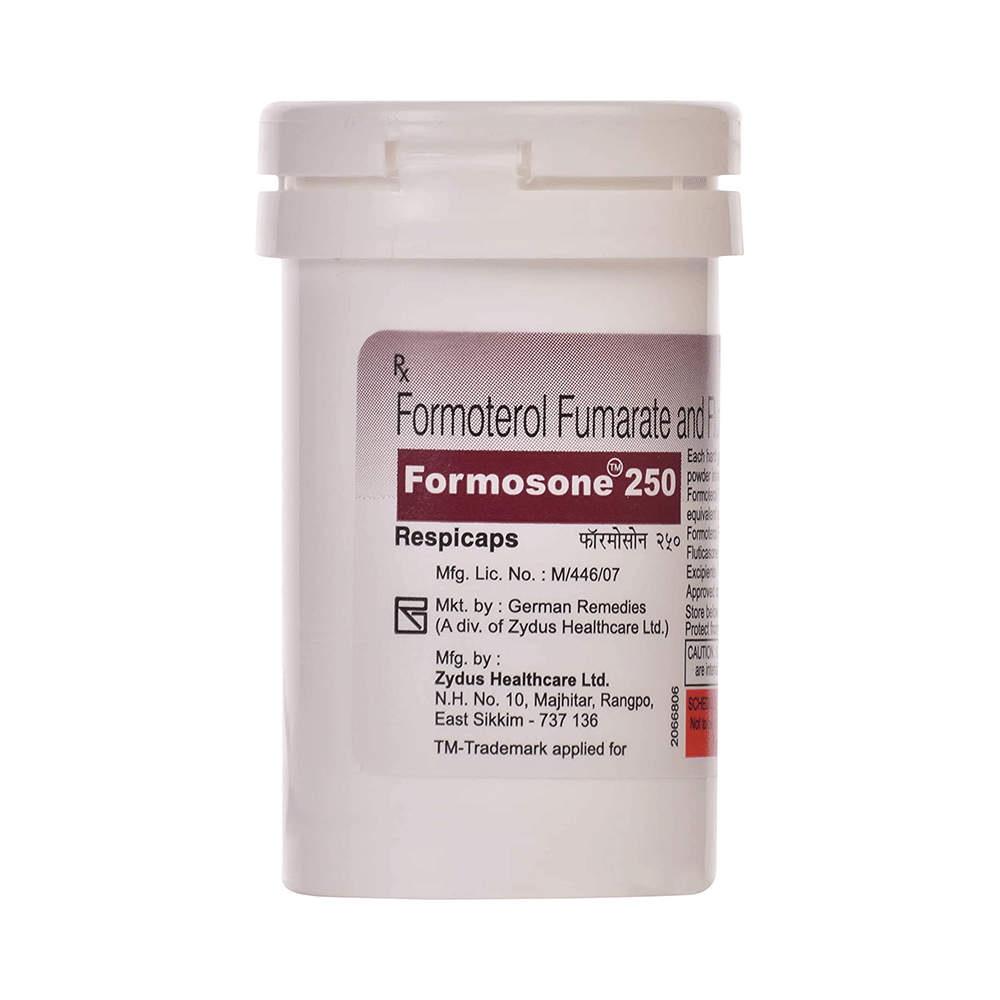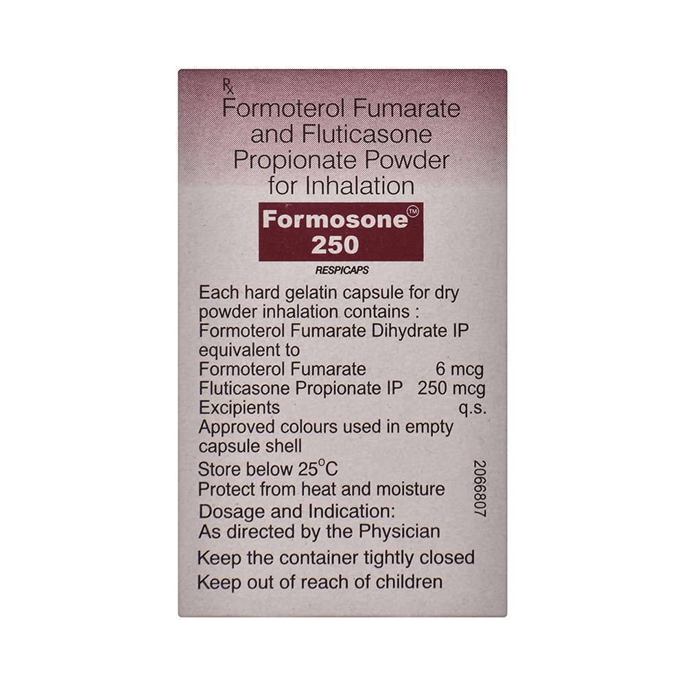 Formosone 250 Respicap is a combination of two medicines: Formoterol and Fluticasone Propionate. Formoterol is a long-acting bronchodilator which works by relaxing the muscles in the airways and widens the airways. Fluticasone Propionate is a steroid. It works by stopping the release of certain chemical messengers that cause inflammation (swelling) of the airways. Together, they make breathing easier.