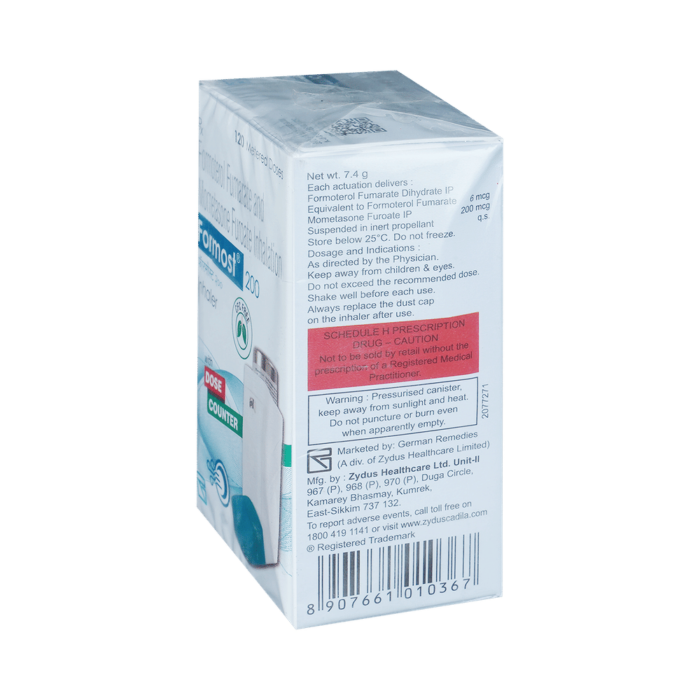 Formost 200 Inhaler is used in the treatment of asthma (wheezing and shortness of breath) and chronic obstructive pulmonary disorder (a lung disorder in which the flow of air to the lungs is blocked). It relaxes the muscles of the air passages and making it easier to breathe. Your doctor will tell you how often you need to use your inhaler. The effect of this medicine may be noticeable after a few days but will only reach its maximum after a few weeks. This medicine must be used regularly to be effective, so go on taking it even if you don't have any symptoms. That means it’s doing its job. If you stop taking it your asthma and COPD may get worse. It should not be used to relieve sudden asthma attacks. If an asthma attack occurs, use your quick-relief inhaler (reliever). To get the benefit from this medicine you need to make sure you get your inhaler technique right, otherwise, it Does not work as well.The most common side effects are nausea, vomiting, respiratory tract infection, fungal infections in the mouth, dry mouth, headache, hoarseness of voice, sore throat, cough, musculoskeletal (bone, muscle, or joint) pain, and increased heart rate. If you get there, don’t stop taking it but do talk to your doctor. You can help prevent some of these symptoms by rinsing your mouth and throat with water or brushing your teeth after using your inhaler. There are other, rarer side effects which can be serious. Talk to your doctor if you're worried about them. In general, you should be trying to avoid situations that make your asthma worse (your triggers) and try not to smoke.Ask your doctor whether it’s safe to take this medicine if you're pregnant or breastfeeding. Before taking it, you should tell your doctor if you have any kidney or liver diseases so that your doctor can prescribe a suitable dose for you.