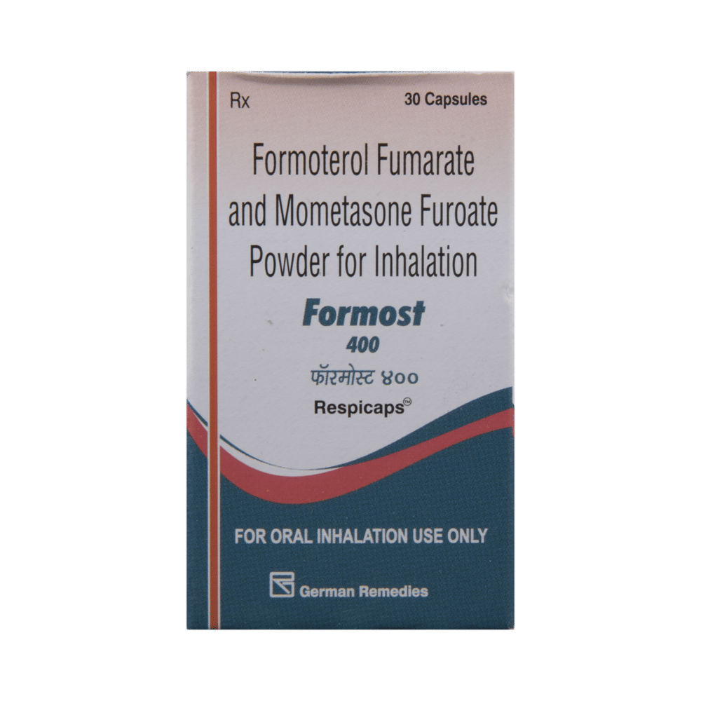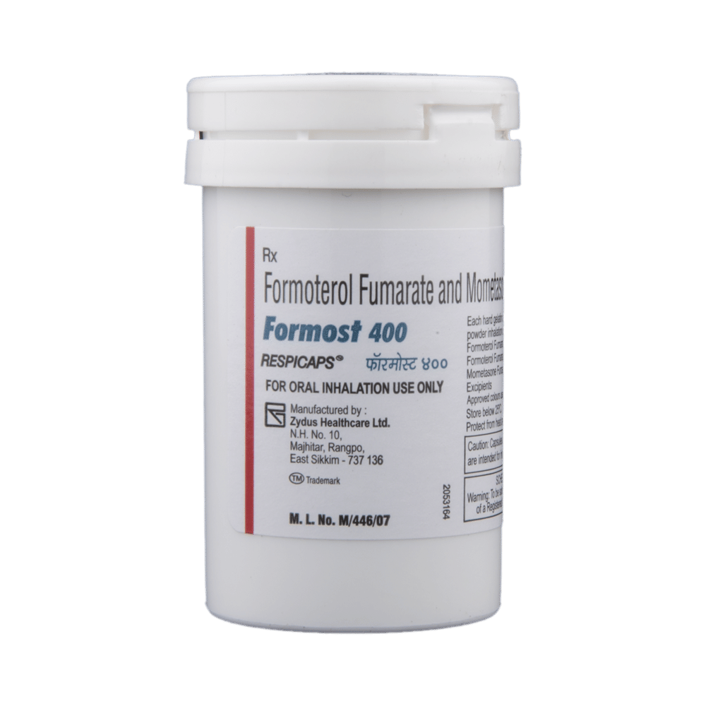 Formost 400 Respicap is a combination of two medicines: Formoterol and Mometasone. Formoterol is a long-acting bronchodilator which works by relaxing the muscles in the airways and widens the airways. Mometasone is a steroid. It works by stopping the release of certain chemical messengers that cause inflammation (swelling) of the airways. Together, they make breathing easier.