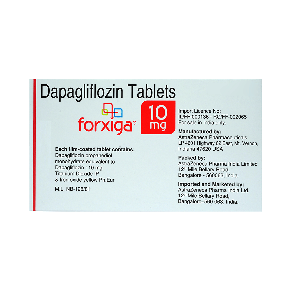 Forxiga 10mg Tablet is used alone or in combination with other medicines to treat type 2 diabetes mellitus. It helps control the high blood sugar levels seen in diabetes. This reduces the chances of serious complications of diabetes and also helps prevent heart disease. Forxiga 10mg Tablet can be taken with or without food at any time of day, but you should try to take it at the same time every day. The dose will be decided by your doctor. Do not stop taking it without asking your doctor. If you do, your blood sugar levels may increase and put you at risk of serious complications like kidney damage and blindness. This medicine is only part of a treatment program that should include a healthy diet, regular exercise, and weight reduction as advised by your doctor.The most common side effects of Forxiga 10mg Tablet include nausea, fungal infection of the vagina, nasopharyngitis (inflammation of the throat and nasal passages), and urinary tract infections. It may cause the body to lose too much water. Drink plenty of fluids to prevent dehydration. Maintaining good hygiene can help prevent the development of fungal infections in the genital area.Before taking this medicine, inform your doctor if you have any kidney or liver problems or a urinary tract infection, or if you are on water pills (diuretics). Pregnant or breastfeeding women should also consult their doctor before taking it. Avoid excessive alcohol intake while taking it, as this may increase the risk of developing some side effects. Monitor your blood sugar levels regularly while taking this medicine.