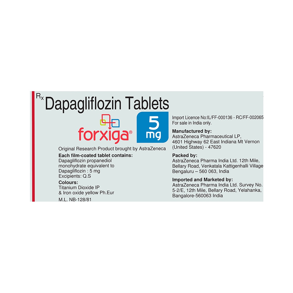 Forxiga 5mg Tablet is used alone or in combination with other medicines to treat type 2 diabetes mellitus. It helps control the high blood sugar levels seen in diabetes. This reduces the chances of serious complications of diabetes and also helps prevent heart disease. Forxiga 5mg Tablet can be taken with or without food at any time of day, but you should try to take it at the same time every day. The dose will be decided by your doctor. Do not stop taking it without asking your doctor. If you do, your blood sugar levels may increase and put you at risk of serious complications like kidney damage and blindness. This medicine is only part of a treatment program that should include a healthy diet, regular exercise, and weight reduction as advised by your doctor.The most common side effects of Forxiga 5mg Tablet include nausea, fungal infection of the vagina, nasopharyngitis (inflammation of the throat and nasal passages), and urinary tract infections. It may cause the body to lose too much water. Drink plenty of fluids to prevent dehydration. Maintaining good hygiene can help prevent the development of fungal infections in the genital area.Before taking this medicine, inform your doctor if you have any kidney or liver problems or a urinary tract infection, or if you are on water pills (diuretics). Pregnant or breastfeeding women should also consult their doctor before taking it. Avoid excessive alcohol intake while taking it, as this may increase the risk of developing some side effects. Monitor your blood sugar levels regularly while taking this medicine.