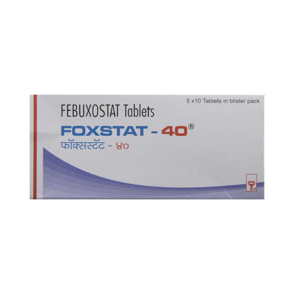 Foxstat 40 Tablet is a medicine used to treat and prevent gout. Gout happens when there is too much uric acid in your body and it forms into crystals that can appear around your joints leading to painful and swollen joints. This medicine helps to keep uric acid levels low. Foxstat 40 Tablet can be taken with or without food. You should keep taking it as recommended by your doctor even when you are not having a gout attack. If you stop, your symptoms may get worse because of the formation of more crystals in your joints. You can help yourself by making some changes to your diet (eg. avoiding alcohol and non-vegetarian foods) and drinking plenty of fluids.Some of the common side effects of this medicine are liver function abnormalities, nausea, joint pain, and rashes. You may experience a temporary increase in the gout symptoms (rapid onset of severe pain, warmth, and redness in the joint) when you first start taking the medicine. However, do not stop taking the medicine. Your doctor may suggest some painkillers and additional medicines to help reduce or prevent these symptoms. Tell your doctor right away if you get any symptoms of liver disease like persistent nausea, dark urine, or yellowing of the eyes or skin.Before taking this medicine, let your doctor know if you have any heart problems, stroke, thyroid problems, or kidney or liver problems. If you are pregnant or breastfeeding, this medicine is best avoided. Check with your doctor. You will need regular blood tests while taking this medicine to check that your liver is working properly.