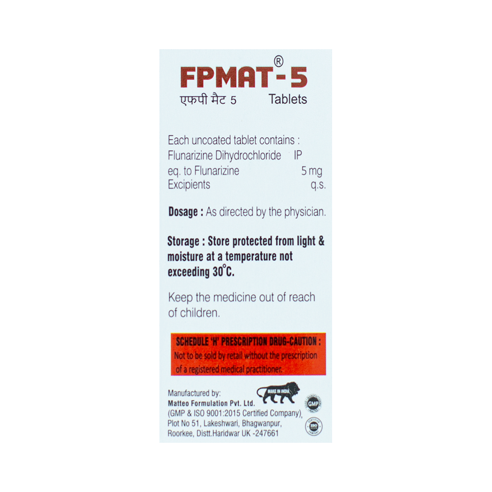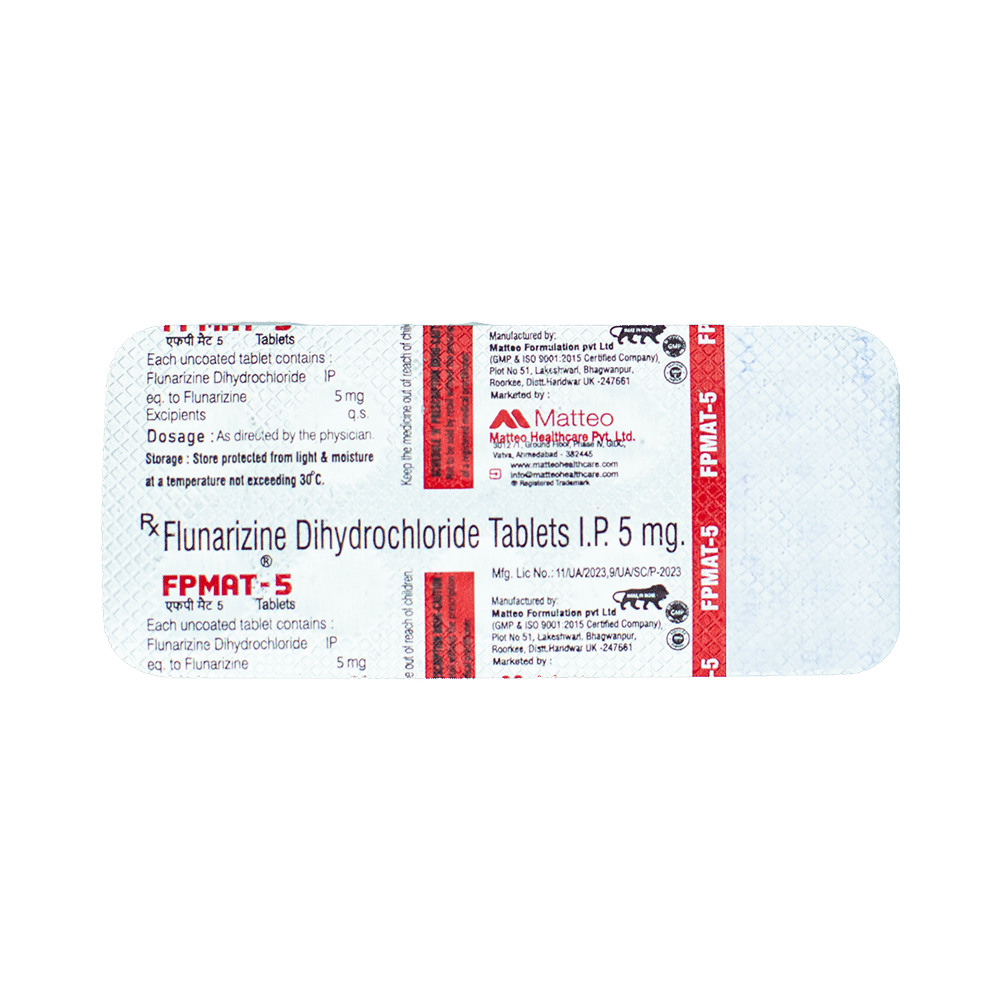 Fpmat 5 Tablet is a medicine used for the prevention of migraines. However, it cannot treat an acute attack and will only work to prevent migraines for as long as you continue to take the medicine. This medicine relaxes the brain, preventing migraine headaches. Fpmat 5 Tablet may be taken with or without food. However, it is advised to take it at the same time each day, as this helps maintain a consistent level of medicine in the body. Do not skip any doses, and finish the full course of treatment even if you feel better. If you have missed a dose, take it as soon as you remember. You should continue to take this medicine for as long as the doctor advises and do not stop taking it suddenly.Side effects associated with the use of Fpmat 5 Tablet include muscle pain, fatigue, constipation, nausea, insomnia (difficulty sleeping), and a runny nose. Some other side effects that may be seen on taking this medicine are increased appetite, depression, stomach discomfort, and breast pain.Fpmat 5 Tablet may also cause sleepiness at the beginning of your treatment, so do not drive or operate machinery until you know how this medicine affects you. It may also cause weight gain, and to prevent it, you can eat a healthy, balanced diet and exercise regularly. This medicine may cause changes in your mood, and you may feel depressed; therefore, regular monitoring of behavior is important. Pregnant or breastfeeding mothers should consult their doctor before taking this medicine.
