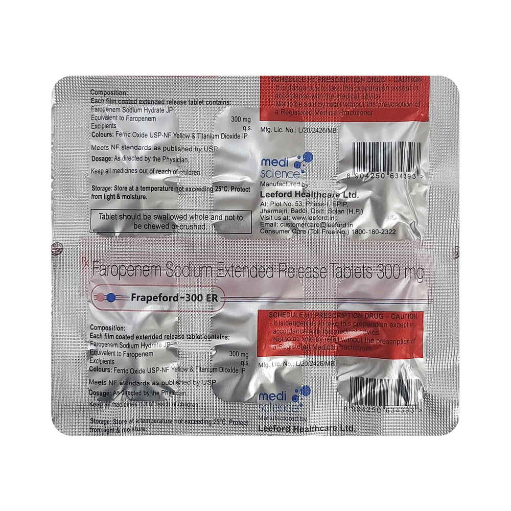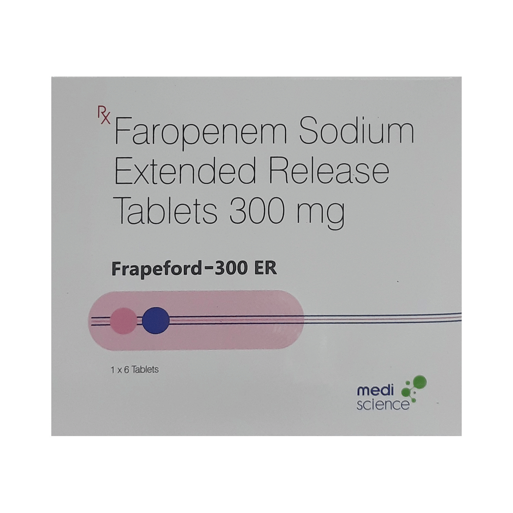 Frapeford 300mg Tablet ER is an antibiotic medicine that is primarily used in the treatment of infections of the lungs and urinary tract. Additionally, it may also be used to treat skin and gynecological infections. It is usually used for infections that did not resolve with other antibiotics. Frapeford 300mg Tablet ER is the only medicine of its class that can be taken orally (by mouth). It may be taken with or without food. The dose and duration of treatment depend upon the severity of the infection and how you respond to the medicine. Take it at the same time each day and finish the complete course, even if you feel better. If you stop taking this medicine too early then the infection may return or worsen.The most common side effects of this medicine include rash, nausea, abdominal pain, and diarrhea. These are usually mild and resolve on their own. However, if they bother you or persist for a longer duration of time, please consult your doctor.Before using it, you should tell your doctor if you are allergic to any antibiotics or if you have any problems related to your kidneys or liver. Let your doctor know about all other medicines you may be taking, as they may affect, or be affected by this medicine. Pregnant and breastfeeding mothers should consult their doctor before using it to prevent any harmful effects on the baby.