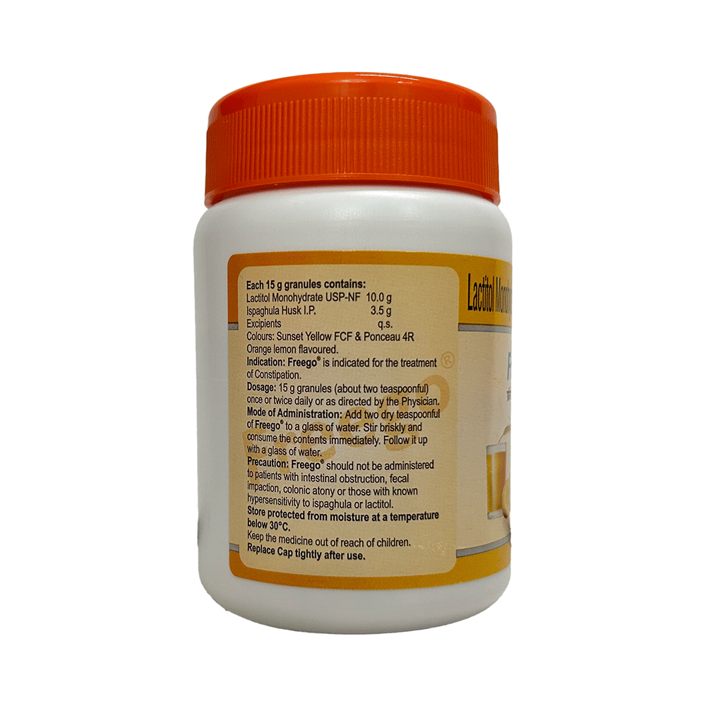 Freego Granules is a combination of lactitol monohydrate and ispaghula. Lactitol monohydrate works by increasing peristalsis (contractions) in the colon, leading to an increase in the number of bowel movements. Ispaghula Husk works by absorbing water and increasing stool volume, making it softer and easier to pass out.