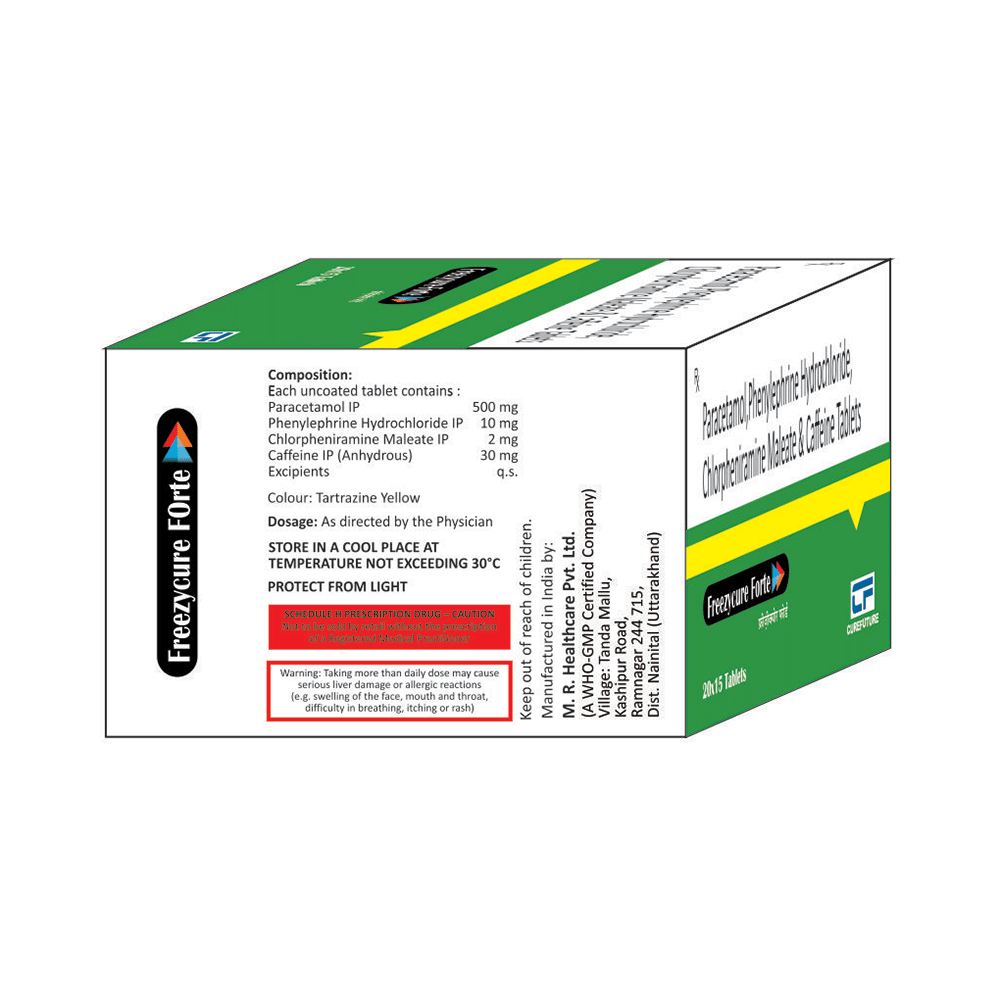 Freezycure-Forte Tablet is a combination of four medicines: Caffeine, Chlorpheniramine Maleate, Paracetamol, and Phenylephrine, which relieves common cold symptoms.