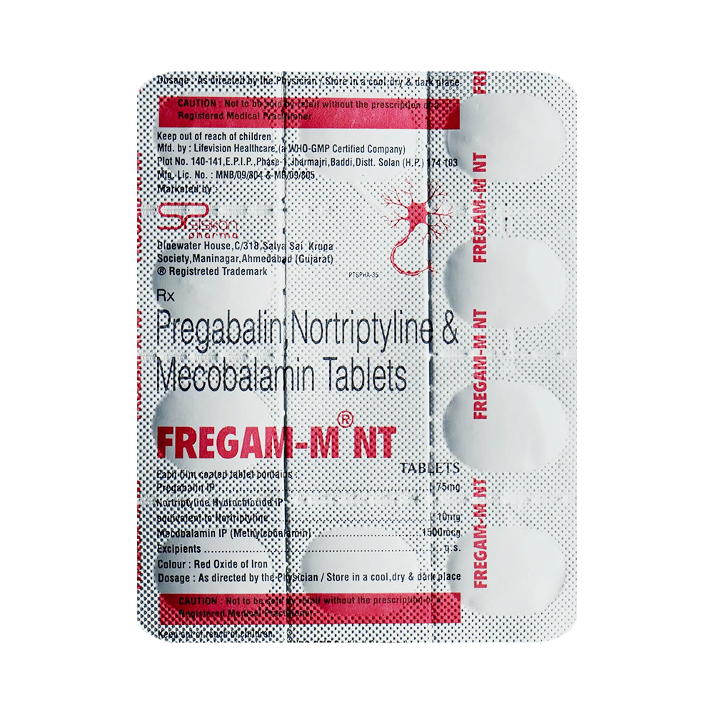 Fregam Mnt 75mg/10mg/1500mcg Tablet is a combination of three medicines: Pregabalin, Nortriptyline and Methylcobalamin. Pregabalin is an alpha 2 delta ligand which decreases pain by modulating calcium channel activity of the nerve cells. Nortriptyline is a tricyclic antidepressant which increases the levels of chemical messengers (serotonin and noradrenaline) that stop the movement of pain signals in the brain. Methylcobalamin is a form of vitamin B which helps in the production of myelin, a substance that protects nerve fibers and rejuvenates damaged nerve cells. Together, they relieve neuropathic pain (pain from damaged nerves).