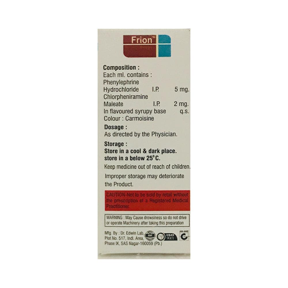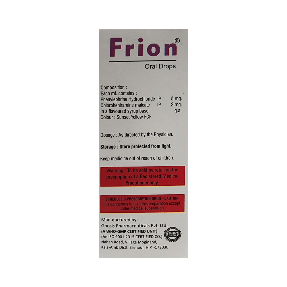 Frion Oral Drops is a combination medicine used for the symptomatic treatment of common cold in children. It helps relieve discomfort caused by a runny nose, blocked nose, and sneezing, allowing the child to breathe more easily and feel better. Frion Oral Drops may be given to your child with or without food. Always follow the exact dose and duration prescribed by the doctor. The dosage will depend on your child’s age, weight, and the severity of symptoms. Do not stop the medicine early, even if your child seems to be feeling better, unless advised by the doctor.Common side effects may include nausea, vomiting, or headache. These are usually mild and temporary. However, if you notice anything unusual or are concerned about how your child is responding to the medicine, consult your doctor promptly. This medicine may also cause drowsiness, so avoid engaging your child in activities that require alertness until you know how it affects them.Make sure your child stays well hydrated while taking Frion Oral Drops. Inform your doctor if your child has any history of liver or kidney problems, as the dose may need to be adjusted accordingly.Note: As per the Ministry of Health and Family Welfare, Frion Oral Drops should not be used in children below 4 years of age.