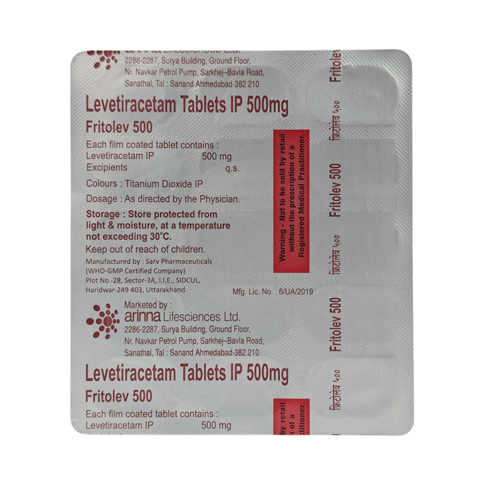 Fritolev 500 Tablet is an anti-epileptic medicine used to treat seizures (fits) in epilepsy. It can be used alone or along with other medicines. It helps to prevent seizures for as long as you continue to take it. Fritolev 500 Tablet suppresses the abnormal electrical activity in the brain. You can take it with or without food but try to take it at the same time each day to get the most benefit. The dose will depend on your condition and how you respond to the medicine. Your doctor will advise the right dose for you. It is generally advised as a long-term treatment. You should continue taking it for as long as your doctor has told you to, even if you feel well. If you stop or miss doses your seizures could get worse.Some common side effects of this medicine include headache, irritation, sleepiness, behavior changes, aggressive behavior, and decreased appetite. Side effects are more common during the first few weeks and usually lessen as your body gets used to the medicine. Most of these side effects do not need medical attention, but some of them can be serious. A small number of people being treated with this medicine have had thoughts of harming or killing themselves. Contact your doctor if your mood changes for the worse.Before taking it, you should tell your doctor if you have kidney problems, depression, or suicidal thoughts and if you are pregnant, planning to become pregnant, or breastfeeding. Your doctor may suggest regular blood tests to monitor your kidney function while taking this medicine.