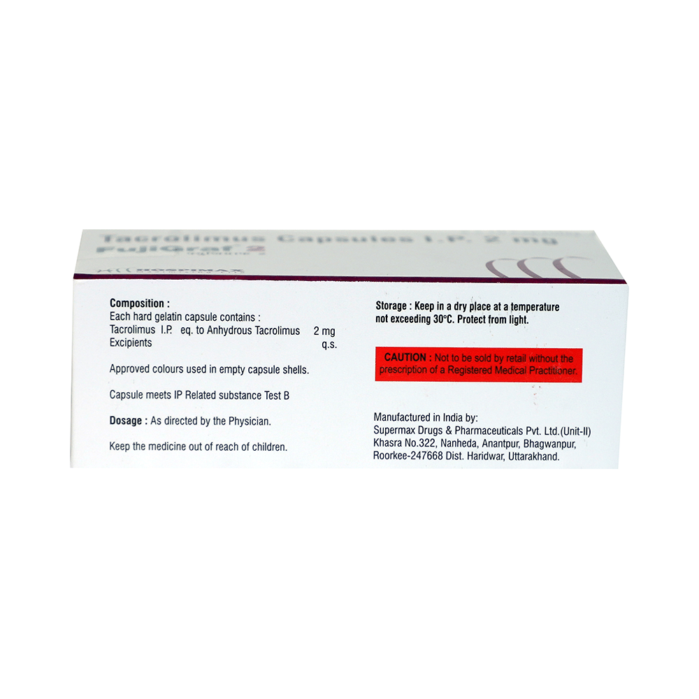 Fujigraf 2 Capsule is used along with other medicines to prevent your body from rejecting a new organ (e.g., liver, kidney, or heart) after transplant. It does so by weakening your body’s immune system, so it does not attack the new organ. This medication belongs to a class of drugs known as immunosuppressants. The amount of Fujigraf 2 Capsule you take and how often you take it depends on the type of transplant you have, your body weight, and what other medicines you are taking. Follow your doctor’s instructions carefully. You should take it on an empty stomach, at least 1 hour before or 2 hours after a meal. Take this medicine regularly to get the maximum benefit and keep taking it, even if you feel well. If you stop taking it, you may increase the chances of rejecting your transplanted organ.Fujigraf 2 Capsule has many potential side effects. It can cause or worsen diabetes and kidney problems. These need urgent medical attention. Other common side effects include tremor, infections, high blood pressure, headache, and insomnia. If the side effects do not go away or get worse, tell your doctor. Fujigraf 2 Capsule lowers your immune system making you susceptible to catching more infections than usual.Before taking this medicine, tell your doctor if you have kidney, liver, or heart problems, diabetes, or high blood pressure. Also let your doctor know what other medications you are taking, especially for infections, pain, and arthritis. These and others may affect, or be affected by, this medicine. You should limit your exposure to the sun and UV (ultraviolet) light while taking it because immunosuppressants could increase your risk of skin cancer.Both men and women using this medicine should use effective birth control to prevent pregnancy. This medicine is not normally recommended during pregnancy or while breastfeeding unless it is clearly needed. Before and during treatment you will need frequent medical tests to monitor your progress, and your blood pressure will need to be checked often.