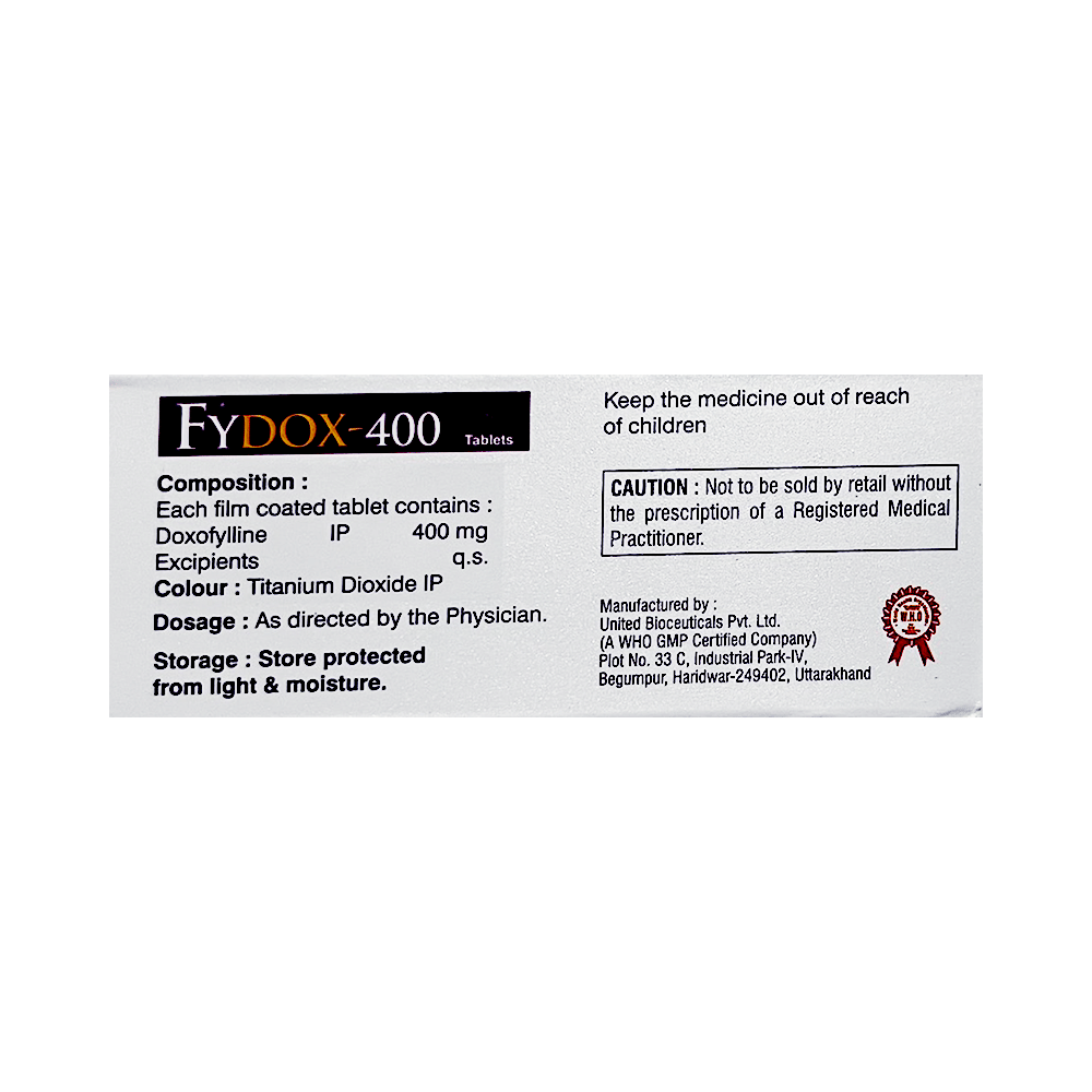 Fydox 400 Tablet is used to treat and prevent symptoms of asthma and chronic obstructive pulmonary disorder (a lung disorder in which flow of air to the lung is blocked). It helps in relaxing the muscles of the air passages, thus widening it and making it easier to breathe. Fydox 400 Tablet can be taken with the food in the evening. Take it in the exact dose and duration as prescribed by your doctor. The dose and how often should take it may depend on what you are taking it for. Take it for as long as it is prescribed for you. In case you missed a dose, take it as soon as you remember it. It does not work immediately or prevent the already started breathing trouble, hence always carry your medical inhaler with you for an emergency.The most common side effects of this medicine include vomiting, headache, nausea, and stomach upset. If these bother you or appear serious, let your doctor know. There may be ways of reducing or preventing them. Generally, it is advised not to consume alcohol or do not smoke while on treatment. You must avoid high caffeinated products like coffee, tea, and dark chocolates as it enhances drug side effects.Before taking this medicine, let your doctor if you have kidney or liver disease or if you have heart-related problems. Your doctor should also know about all other medicines you are taking as many of these may make this medicine less effective or change the way it works. Inform your doctor if you are pregnant or breastfeeding before starting the treatment.