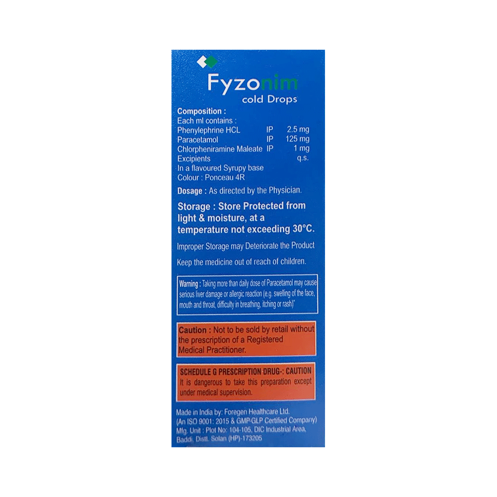 Fyzonim Cold Oral Drops is commonly prescribed in children to treat common cold symptoms like sore throat, runny nose, cough, sneezing, watery eyes, body ache, and fever. Give Fyzonim Cold Oral Drops to your child by mouth with or without food. Children often have a sensitive stomach and complain of stomach upset while taking medicines. Prefer giving this medicine with food if this happens. Always remember that the dosing schedule provided by your child’s doctor depends on the type of symptoms your child has, so make sure to follow the prescribed dose, time, and way strictly.Give Fyzonim Cold Oral Drops at a fixed time each day so that it gradually makes a place in your child’s daily routine, which will help you to remember. If your child vomits within 30 minutes of taking this medicine give the same dose again. However, never repeat the dose if it's already time for the next dose. Your child may start to feel better within a week of regular dosing. However, you must continue giving the medicine to your child to finish the complete prescribed course as stopping it abruptly may worsen your child’s condition.Some of the minor and temporary side effects that your child may experience while taking this medicine include vomiting, diarrhea, nausea, dizziness, rash, and headache. Usually, these episodes subside once your child’s body adapts to the medicine. In case these side effects persist or become bothersome for your child, consult your child’s doctor without any delay.Narrate your child’s complete medical history to your child’s doctor, including any ongoing medicine regime or history of any allergy, heart problem, blood disorder, birth defects, airway obstruction, lung anomaly, skin disorder, liver impairment, and kidney malfunction. This information is critical for dose alterations and for planning your child’s overall treatment.