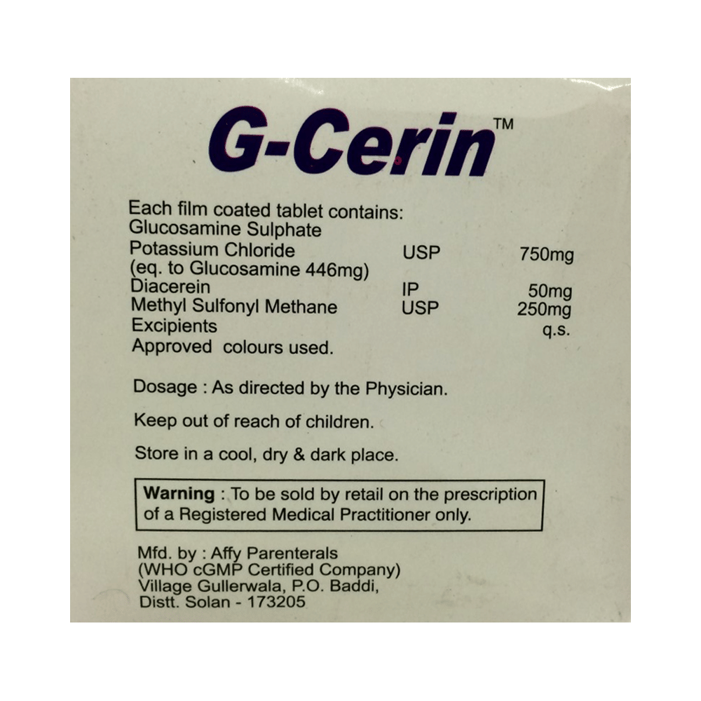 G-Cerin Tablet is a combination of three medicines: Glucosamine, Diacerein and Methyl Sulfonyl Methane, which treats osteoarthritis. Glucosamine and Diacerein are proteoglycan synthesis stimulators while Methyl Sulfonyl Methane (MSM) is a nutritional supplement. Together, they help in the building of cartilage (the soft tissue around the joints) leading to joint repair. MSM additionally lowers inflammation (swelling) of the joints.
