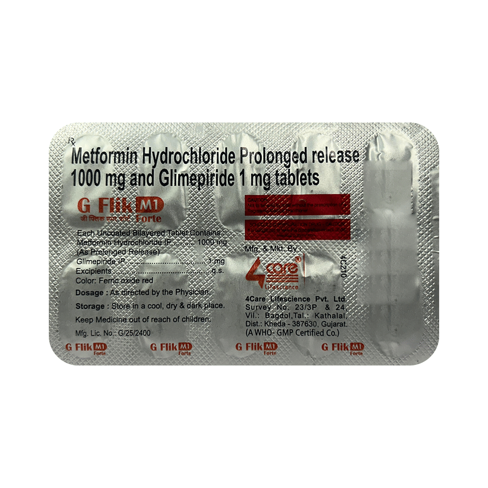 G Flik M1 Forte Tablet PR belongs to a category of medicines known as anti-diabetic drugs. It is a combination of two medicines used to treat type 2 diabetes mellitus in adults. It helps control blood sugar levels in people with diabetes. G Flik M1 Forte Tablet PR should be taken with food. Take it regularly at the same time each day to get the most benefit. Your doctor will decide what dose is best for you, and this may change from time to time according to how it is working, according to your blood sugar levels.Keep taking this medicine, even if you feel well or your blood sugar levels are controlled. If you stop it without consulting your doctor, your blood sugar levels could rise and put you at risk of kidney damage, blindness, nerve problems, and loss of limbs. Remember that it is only part of a treatment program that should also include a healthy diet, regular exercise, and weight reduction as advised by your doctor. Your lifestyle plays a big part in controlling diabetes.The most common side effect of G Flik M1 Forte Tablet PR is low blood glucose levels (hypoglycemia). Make sure you recognize the signs of having low blood glucose levels, such as sweating, dizziness, headache, and shaking, and know how to deal with them. To prevent this, it's important to have regular meals and always carry a fast-acting source of glucose, such as sugary food or fruit juice, with you. Drinking alcohol can also increase your risk of low blood sugar levels and should be avoided. Other side effects that may be seen on taking this medicine include taste changes, nausea, diarrhea, stomach pain, headache, and upper respiratory tract infection. Some people may find that they put on weight with this medicine.You should not take it if you have type 1 diabetes mellitus, diabetic ketoacidosis (high levels of acid in your blood), or severe kidney or liver disease. Before taking this medicine, tell your doctor if you have ever had heart disease. It may not be suitable. Pregnant or breastfeeding women should also consult their doctor before taking it. Your blood sugar levels should be checked regularly, and your doctor may also advise blood tests to monitor your blood cell counts and liver function.