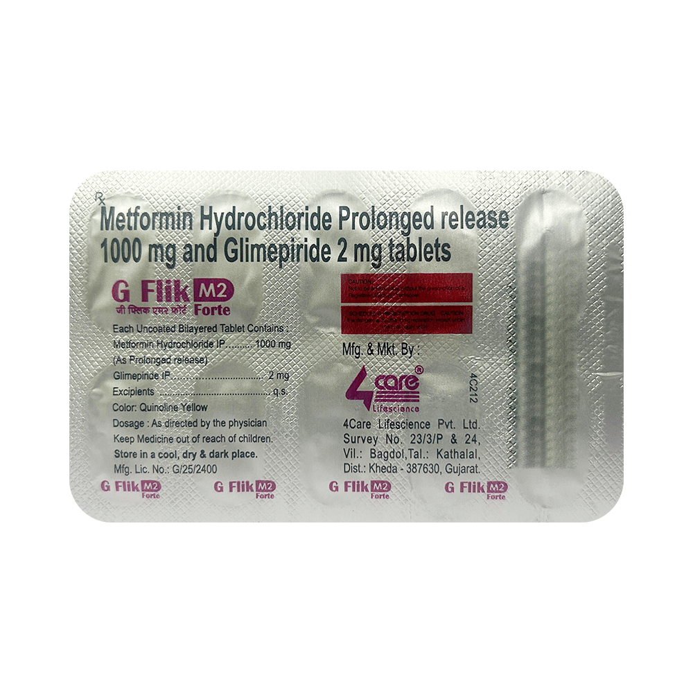 G Flik M2 Forte Tablet PR belongs to a category of medicines known as anti-diabetic drugs. It is a combination of two medicines used to treat type 2 diabetes mellitus in adults. It helps control blood sugar levels in people with diabetes. G Flik M2 Forte Tablet PR should be taken with food. Take it regularly at the same time each day to get the most benefit. Your doctor will decide what dose is best for you, and this may change from time to time according to how it is working, according to your blood sugar levels.Keep taking this medicine, even if you feel well or your blood sugar levels are controlled. If you stop it without consulting your doctor, your blood sugar levels could rise and put you at risk of kidney damage, blindness, nerve problems, and loss of limbs. Remember that it is only part of a treatment program that should also include a healthy diet, regular exercise, and weight reduction as advised by your doctor. Your lifestyle plays a big part in controlling diabetes.The most common side effect of G Flik M2 Forte Tablet PR is low blood glucose levels (hypoglycemia). Make sure you recognize the signs of having low blood glucose levels, such as sweating, dizziness, headache, and shaking, and know how to deal with them. To prevent this, it's important to have regular meals and always carry a fast-acting source of glucose, such as sugary food or fruit juice, with you. Drinking alcohol can also increase your risk of low blood sugar levels and should be avoided. Other side effects that may be seen on taking this medicine include taste changes, nausea, diarrhea, stomach pain, headache, and upper respiratory tract infection. Some people may find that they put on weight with this medicine.You should not take it if you have type 1 diabetes mellitus, diabetic ketoacidosis (high levels of acid in your blood), or severe kidney or liver disease. Before taking this medicine, tell your doctor if you have ever had heart disease. It may not be suitable. Pregnant or breastfeeding women should also consult their doctor before taking it. Your blood sugar levels should be checked regularly, and your doctor may also advise blood tests to monitor your blood cell counts and liver function.