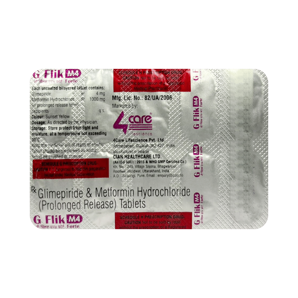 G Flik M4 Forte Tablet PR belongs to a category of medicines known as anti-diabetic drugs. It is a combination of two medicines used to treat type 2 diabetes mellitus in adults. It helps control blood sugar levels in people with diabetes. G Flik M4 Forte Tablet PR should be taken with food. Take it regularly at the same time each day to get the most benefit. Your doctor will decide what dose is best for you, and this may change from time to time according to how it is working, according to your blood sugar levels.Keep taking this medicine, even if you feel well or your blood sugar levels are controlled. If you stop it without consulting your doctor, your blood sugar levels could rise and put you at risk of kidney damage, blindness, nerve problems, and loss of limbs. Remember that it is only part of a treatment program that should also include a healthy diet, regular exercise, and weight reduction as advised by your doctor. Your lifestyle plays a big part in controlling diabetes.The most common side effect of G Flik M4 Forte Tablet PR is low blood glucose levels (hypoglycemia). Make sure you recognize the signs of having low blood glucose levels, such as sweating, dizziness, headache, and shaking, and know how to deal with them. To prevent this, it's important to have regular meals and always carry a fast-acting source of glucose, such as sugary food or fruit juice, with you. Drinking alcohol can also increase your risk of low blood sugar levels and should be avoided. Other side effects that may be seen on taking this medicine include taste changes, nausea, diarrhea, stomach pain, headache, and upper respiratory tract infection. Some people may find that they put on weight with this medicine.You should not take it if you have type 1 diabetes mellitus, diabetic ketoacidosis (high levels of acid in your blood), or severe kidney or liver disease. Before taking this medicine, tell your doctor if you have ever had heart disease. It may not be suitable. Pregnant or breastfeeding women should also consult their doctor before taking it. Your blood sugar levels should be checked regularly, and your doctor may also advise blood tests to monitor your blood cell counts and liver function.