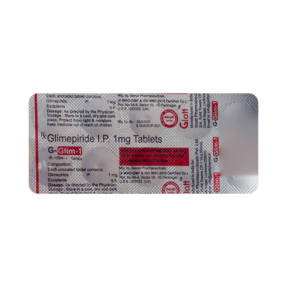 G-Glim 1 Tablet belongs to a group of medicines called sulfonylureas and is used to treat type 2 diabetes mellitus in adults. It helps control blood sugar levels in people with diabetes thereby preventing serious complications of diabetes such as kidney damage and blindness. G-Glim 1 Tablet may be used alone or along with other medicines. It should be taken just before or with the first meal of the day. Take it regularly at the same time each day to get the maximum benefit. Your doctor will decide what dose is best for you and this may change from time to time according to your blood sugar levels.Keep taking G-Glim 1 Tablet, even if you feel well or your blood sugar levels are controlled. If you stop it without consulting your doctor, your blood sugar levels could rise to put you at risk of diabetes complications such as kidney damage, blindness, nerve problems, and loss of limbs. Remember that it is only part of a treatment program that should also include a healthy diet, regular exercise, and weight reduction as advised by your doctor. Your lifestyle plays a big part in controlling diabetes.The most common side effects of taking G-Glim 1 Tablet include low blood sugar levels (hypoglycemia), nausea, headache, weakness, and dizziness. Make sure you recognize the signs of having low blood sugar levels, such as sweating, dizziness, headache, and shaking, and know how to deal with them. To prevent this, it is important to have regular meals and always carry a fast-acting source of glucose such as sugary food or fruit juice with you. Drinking alcohol can also increase your risk of low blood sugar levels and hence should be avoided. Some people may experience an increase in weight with this medicine.You should not take G-Glim 1 Tablet if you have type 1 diabetes mellitus, diabetic ketoacidosis (high levels of acid in your blood), or if you have severe kidney or liver disease. Before taking this medicine, tell your doctor if you have ever had heart disease, thyroid disease, or some hormonal conditions, as it may not be suitable. Pregnant or breastfeeding women should also consult their doctor before taking it. Your blood sugar levels should be checked regularly and your doctor may also advise blood tests to monitor your blood cell counts and liver function.