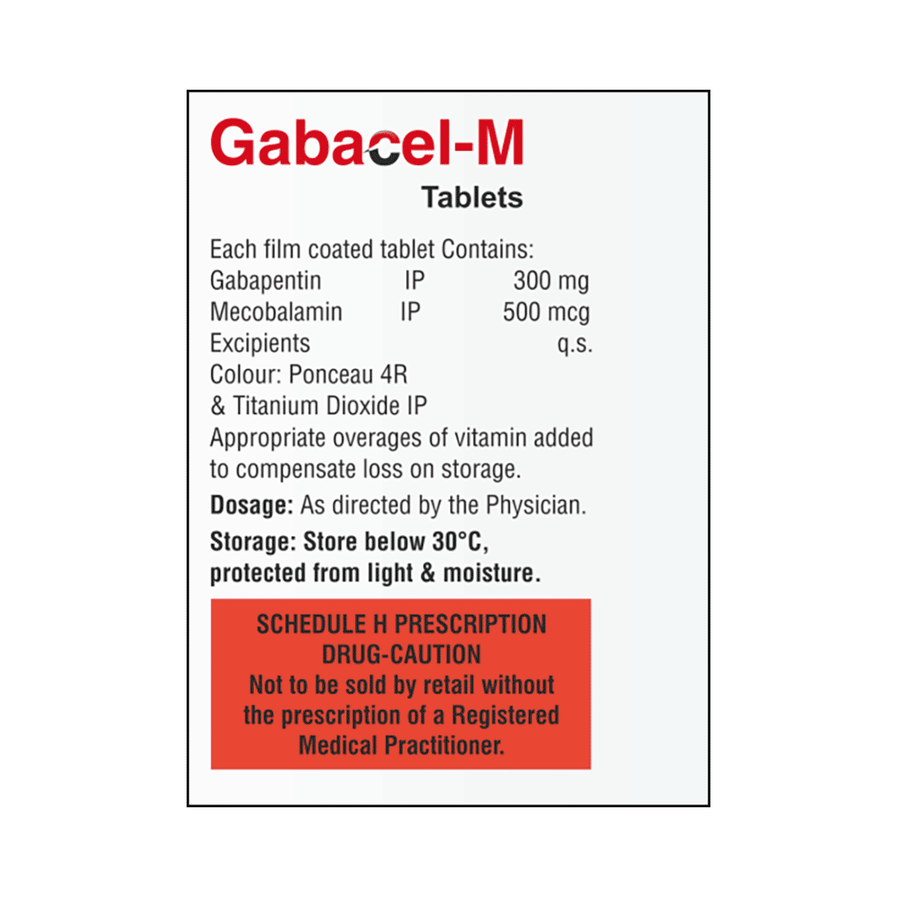 Gabacel-M Tablet is a combination medicine used for the treatment of neuropathic pain. This medicine decreases pain by modulating calcium channel activity of the nerve cells. Gabacel-M Tablet is taken by mouth with or without food, preferably at bedtime. It is advised to take medicine at the same time each day as this helps to maintain a consistent level of medicine in the body. Take this medicine in the dose and duration advised by your doctor. If you miss a dose of this medicine, take it as soon as you remember. Finish the full course of treatment even if you feel better. It is important that this medication is not stopped suddenly without talking to the doctor.Some common side effects of this medicine are nausea, peripheral edema, ataxia, blurred vision, fever and nystagmus (involuntary eye movement). It may also cause dizziness and sleepiness, so do not drive or do anything that requires mental focus until you know how this medicine affects you. It is important to inform your doctor if you develop any unusual changes in mood or behavior, new or worsening depression, or suicidal thoughts.Before taking the medicine you should tell your doctor if you are pregnant, planning to become pregnant, or breastfeeding. It can usually be mixed safely with other medicines but some drugs (including antacids and alcohol) do affect the way it works and can increase the chance of side effects.