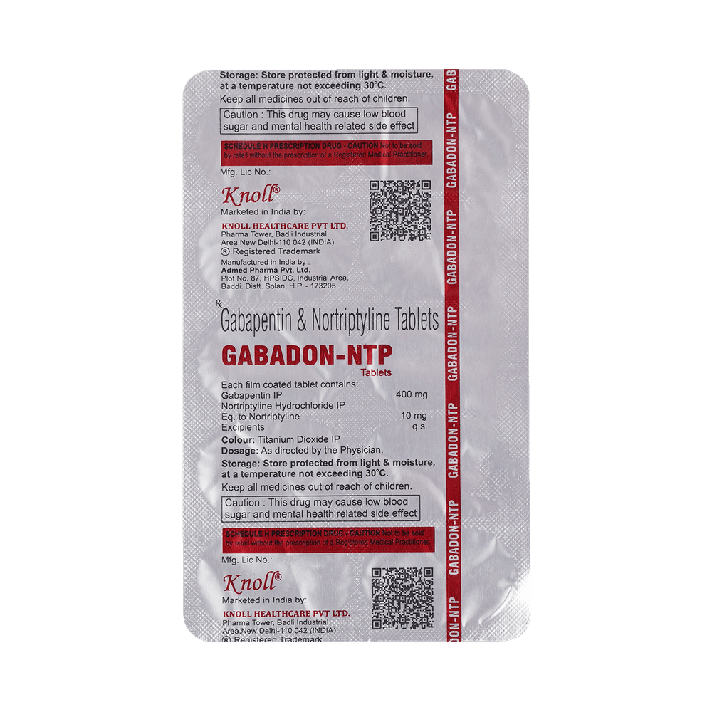 Gabadon-NTP 400mg/10mg Tablet is a combination of two medicines: Gabapentin and Nortriptyline. Gabapentin is an alpha 2 delta ligand which decreases the pain by modulating calcium channel activity of the nerve cells. Nortriptyline is a tricyclic antidepressant which increases the levels of chemical messengers (serotonin and noradrenaline) that stop the movement of pain signals in the brain. Together, they relieve neuropathic pain (pain from damaged nerves).